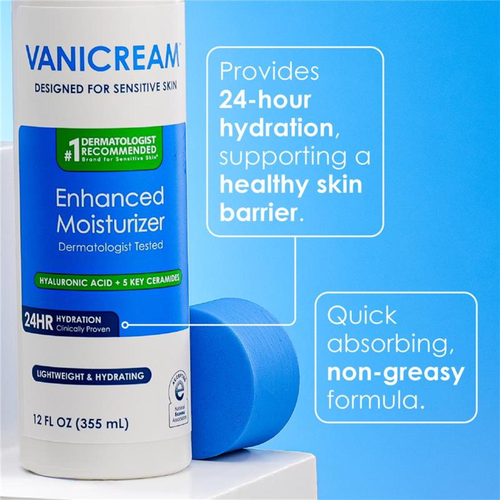 Vanicream Enhanced Moisturizer is a lightweight moisturizer providing effective hydration both day and night for sensitive skin. Formulated with hyaluronic acid, 5 key ceramides, and glycerin, this moisturizer has been tested to provide all-day hydration while supporting a healthy skin barrier.