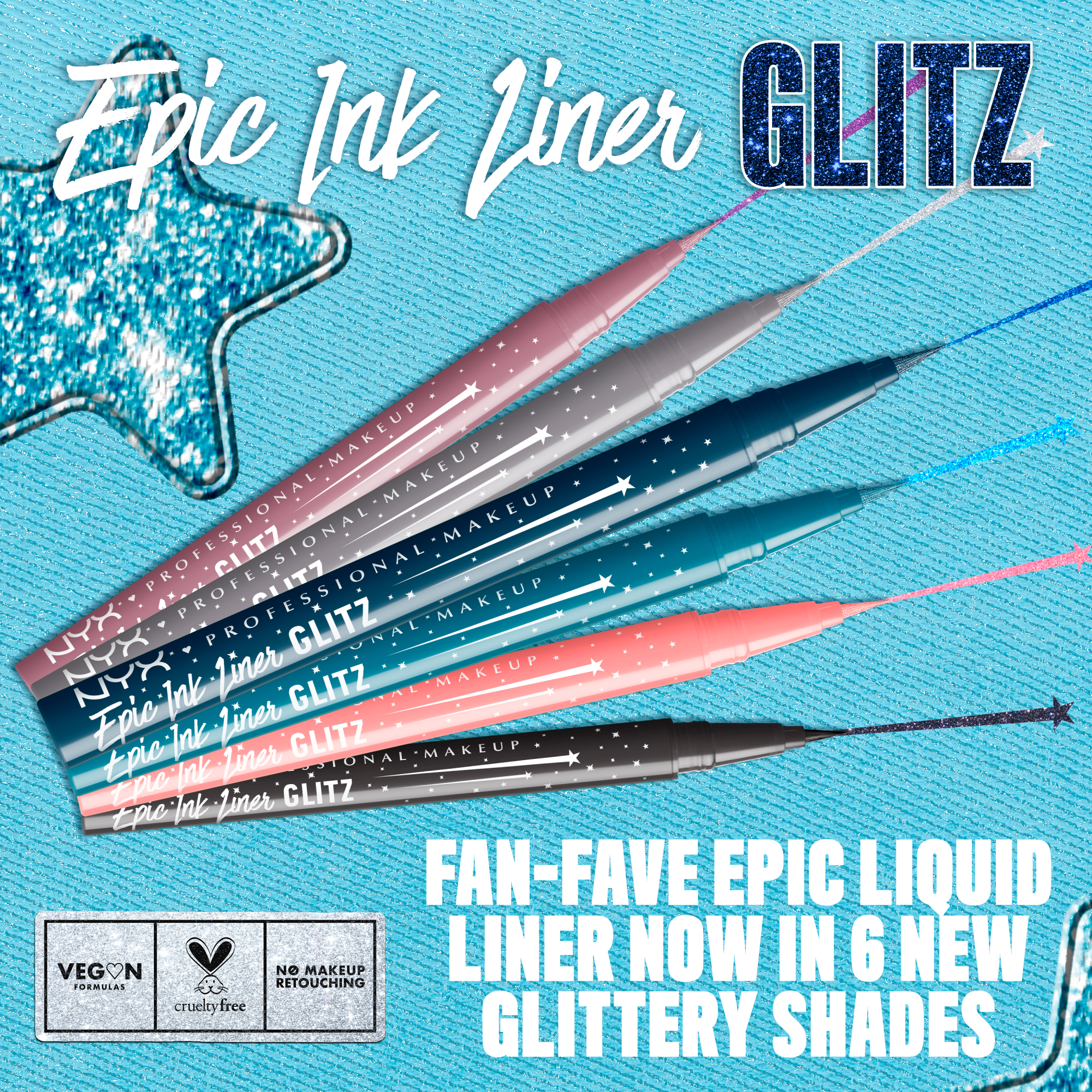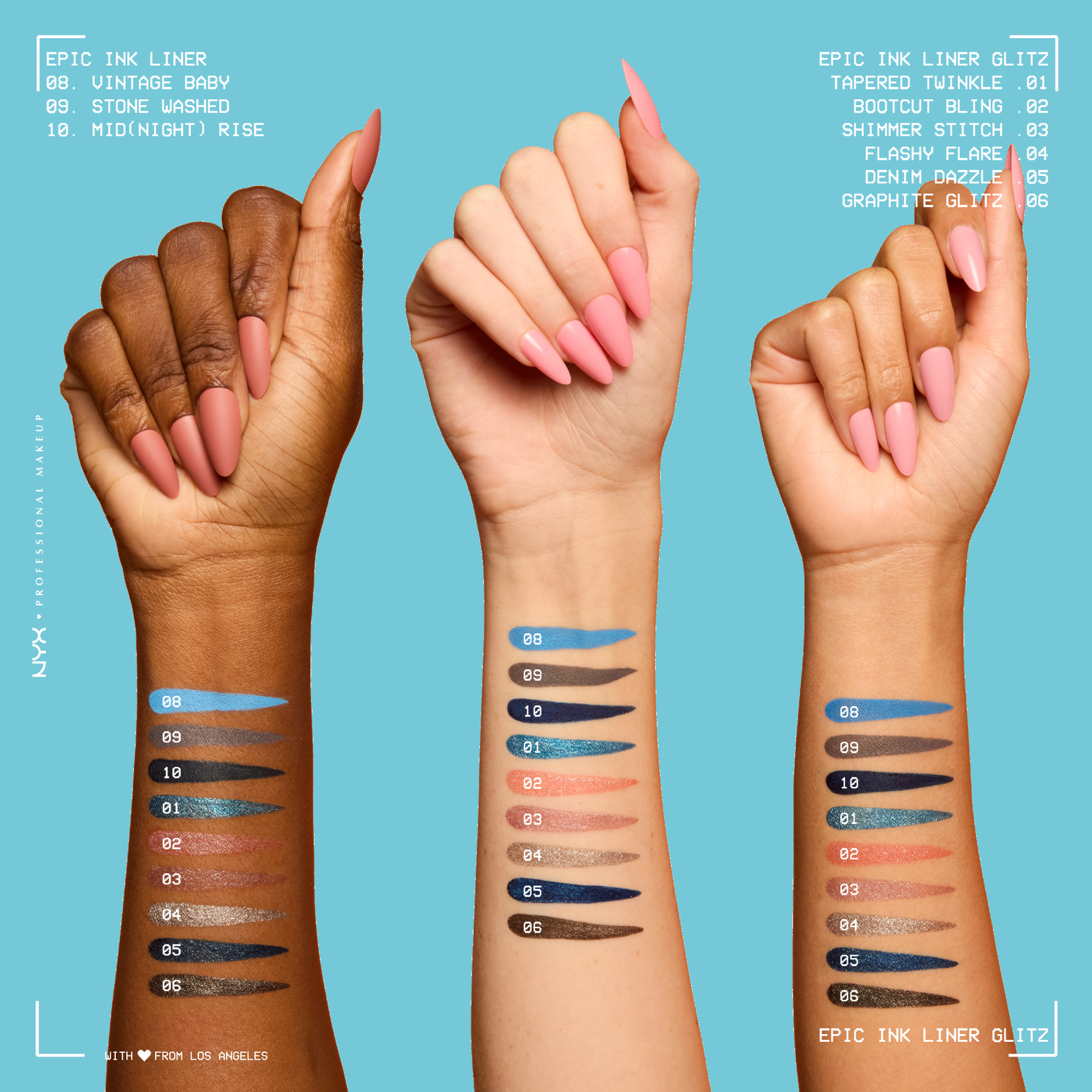 NYX Professional Makeup Epic Ink #1 liquid eyeliner is available in glitter metallic shades. 24HR wear. Ultra precise, 1-swipe matte liner.