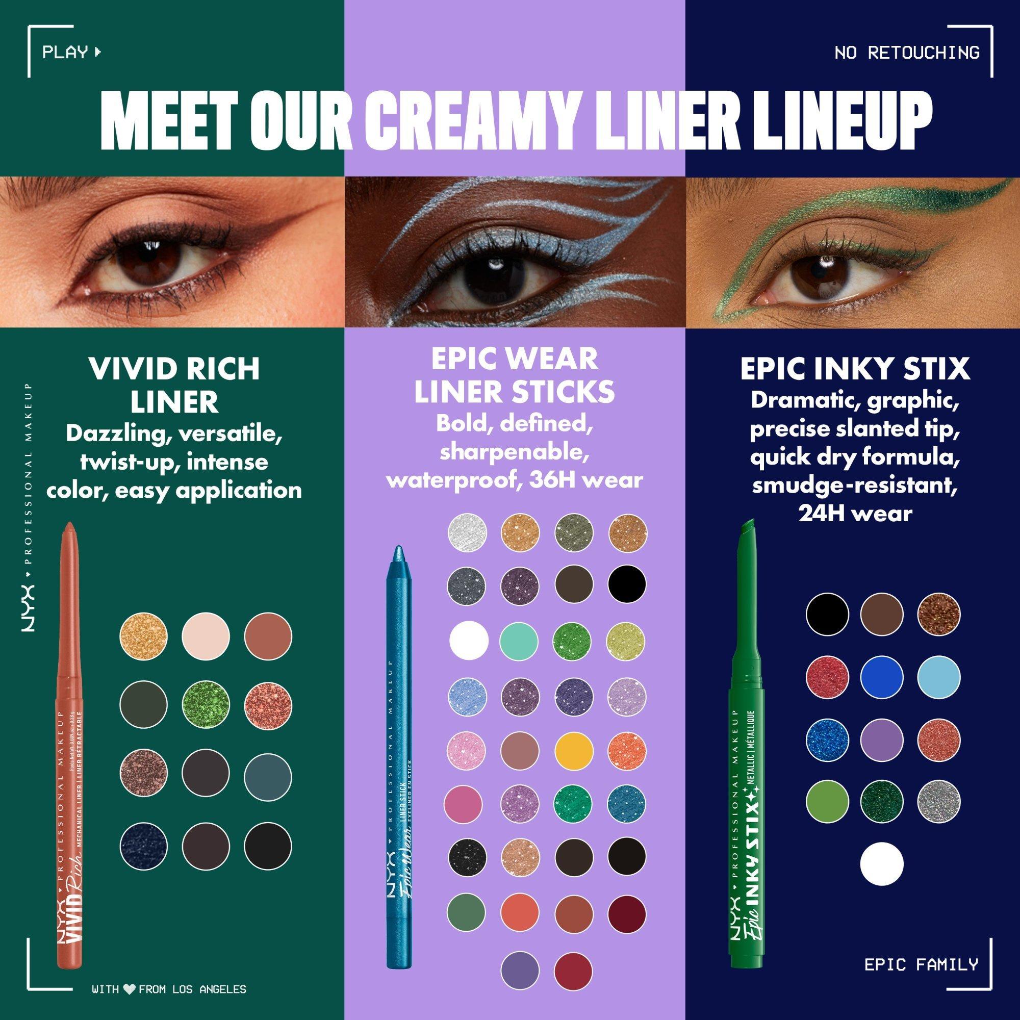 Epic Inky color in a click! NEW NYX Professional Makeup Epic Inky Stix, a waterproof cream mechanical gel eyeliner that delivers 1-swipe fluid color that lasts up to 24hr.