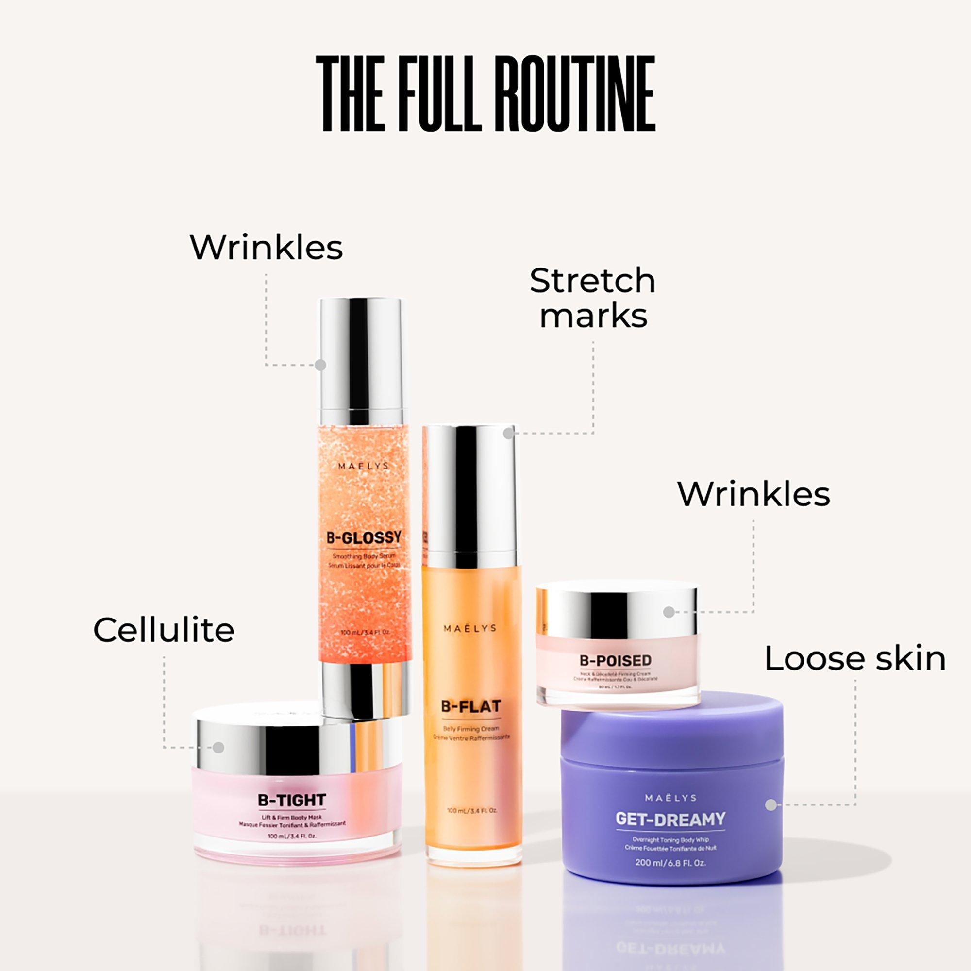 Start your routine with B-GLOSSY Body Serum to prep \& target the look of wrinkles. Follow with your favorite reshapers twice a day for a more targeted approach.