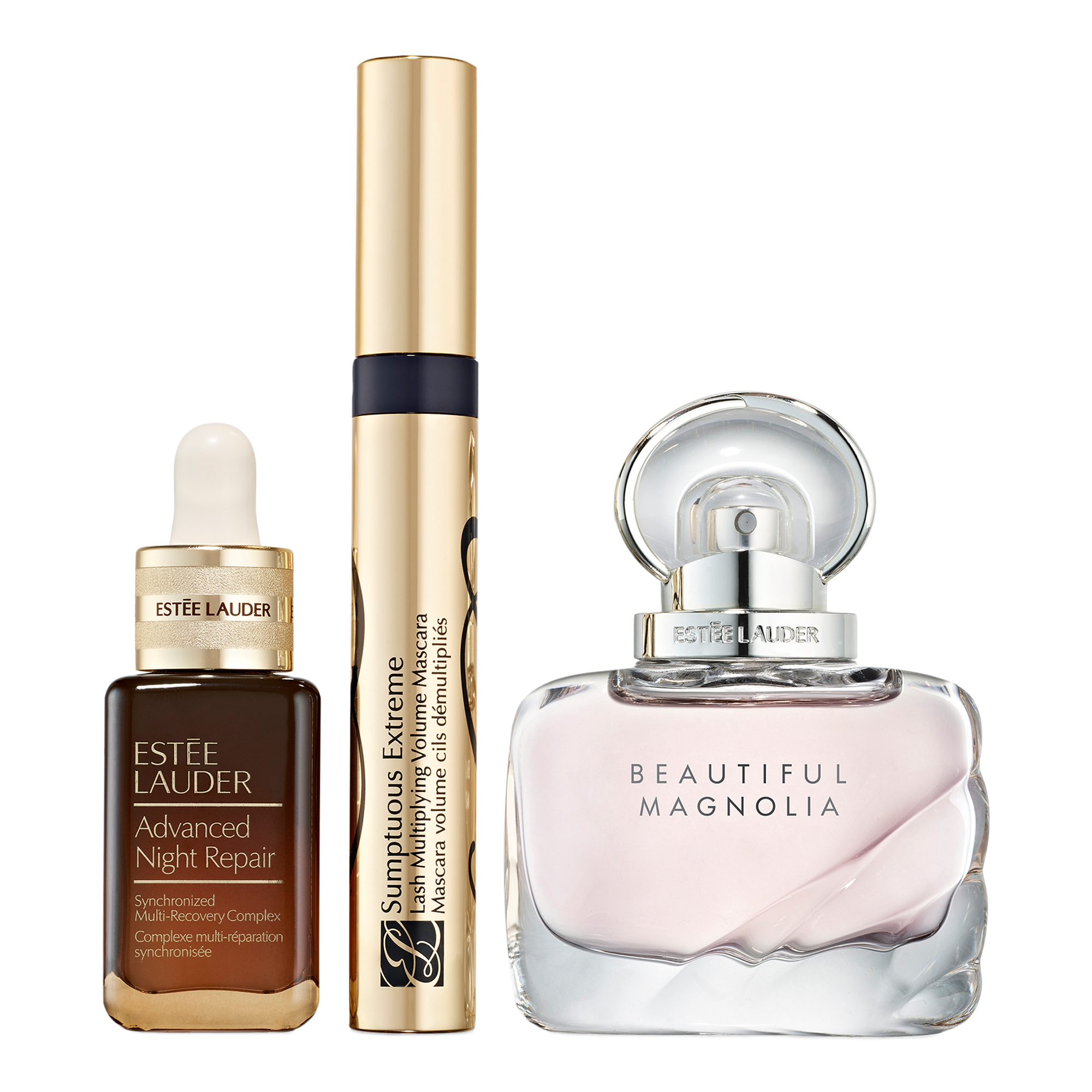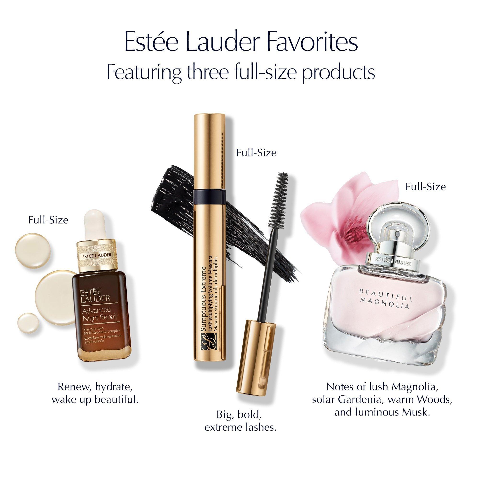 Enjoy Estée Lauder favorites with the Estée Favorites Gift Set including 3 full sizes in skincare, makeup and fragrance and a full size Advanced Night Repair Serum.