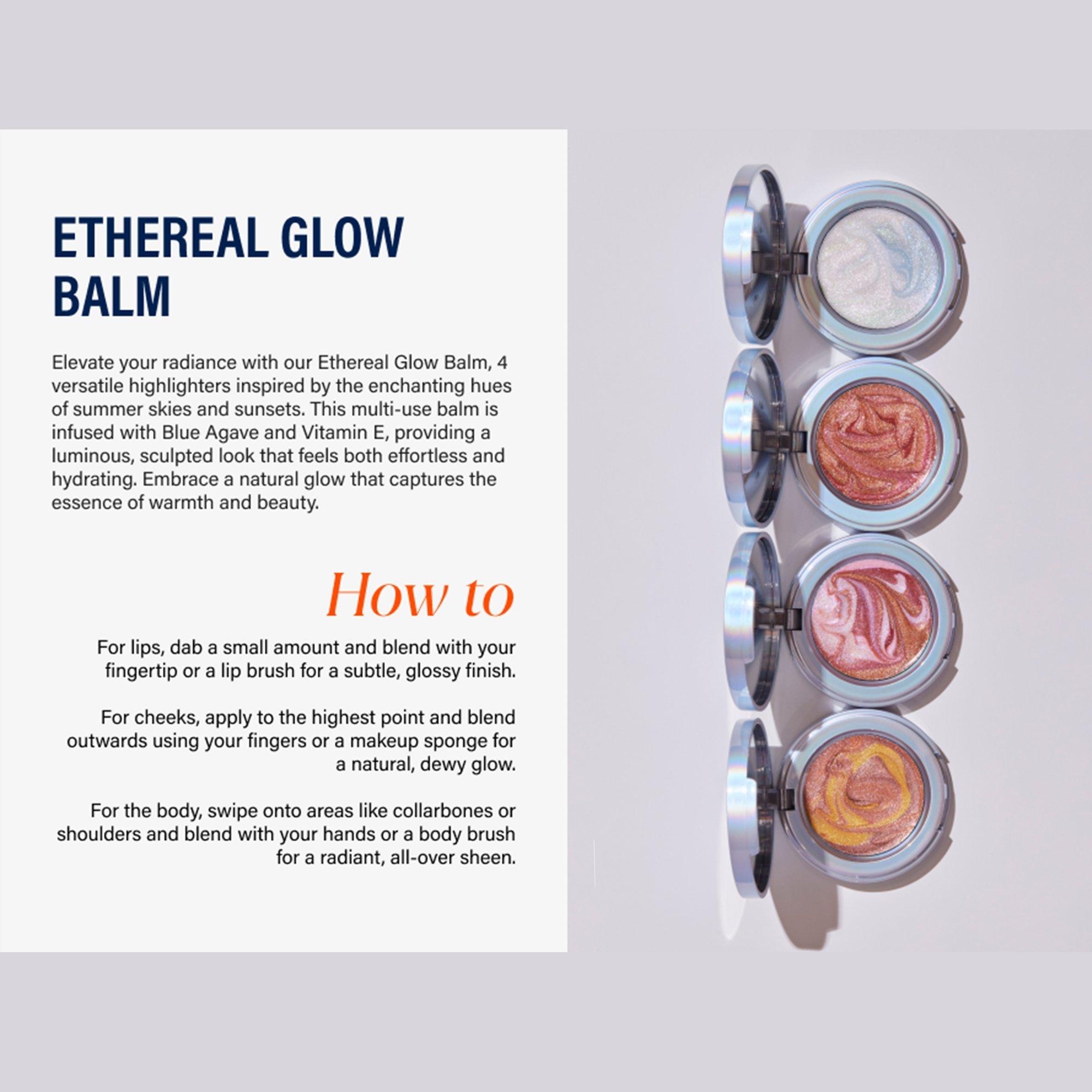 Elevate your radiance with our Ethereal Glow Balm, 4 versatile highlighters inspired by the enchanting hues of summer skies and sunsets. This multi-use balm is infused with Blue Agave and Vitamin E, providing a luminous, sculpted look that feels both effortless and hydrating.