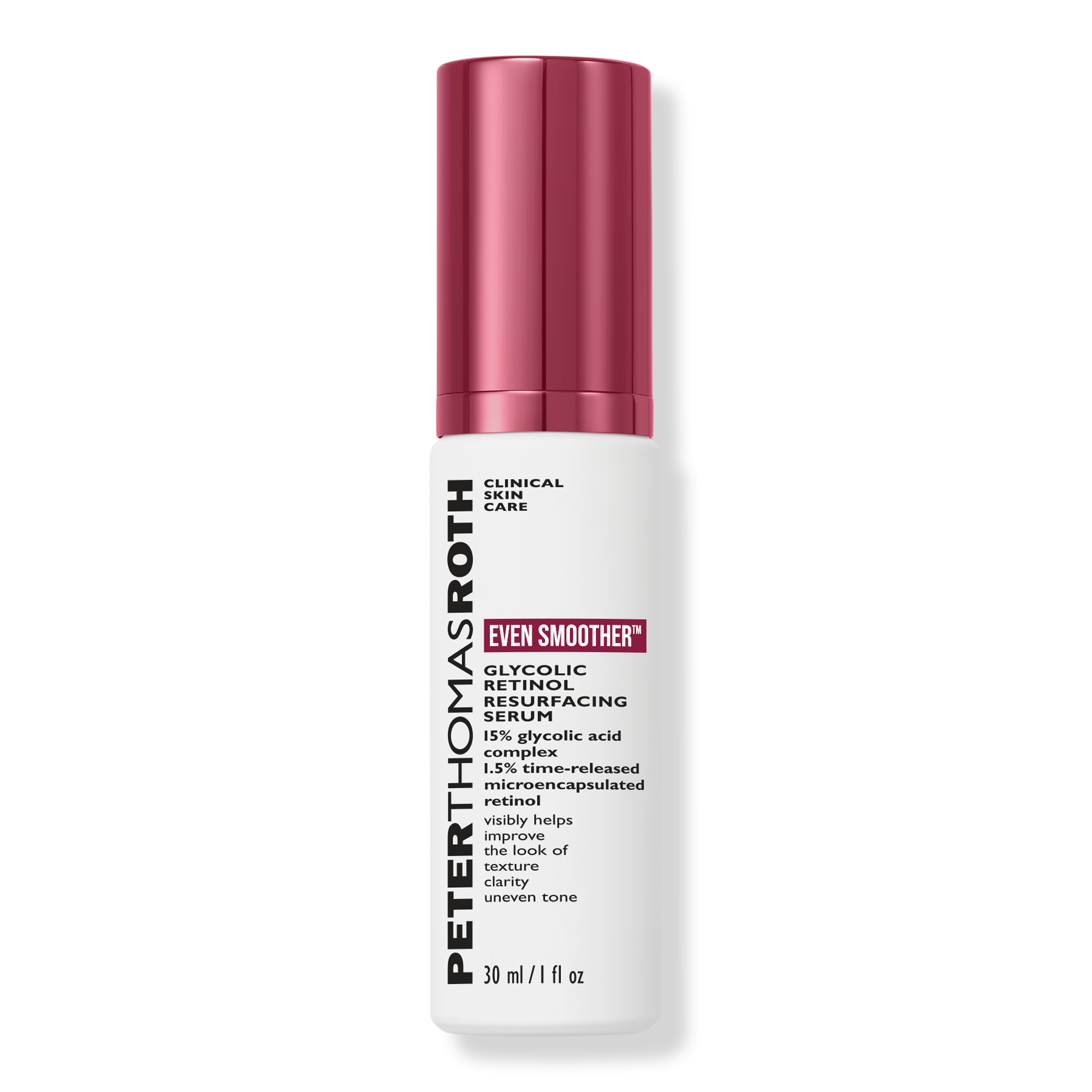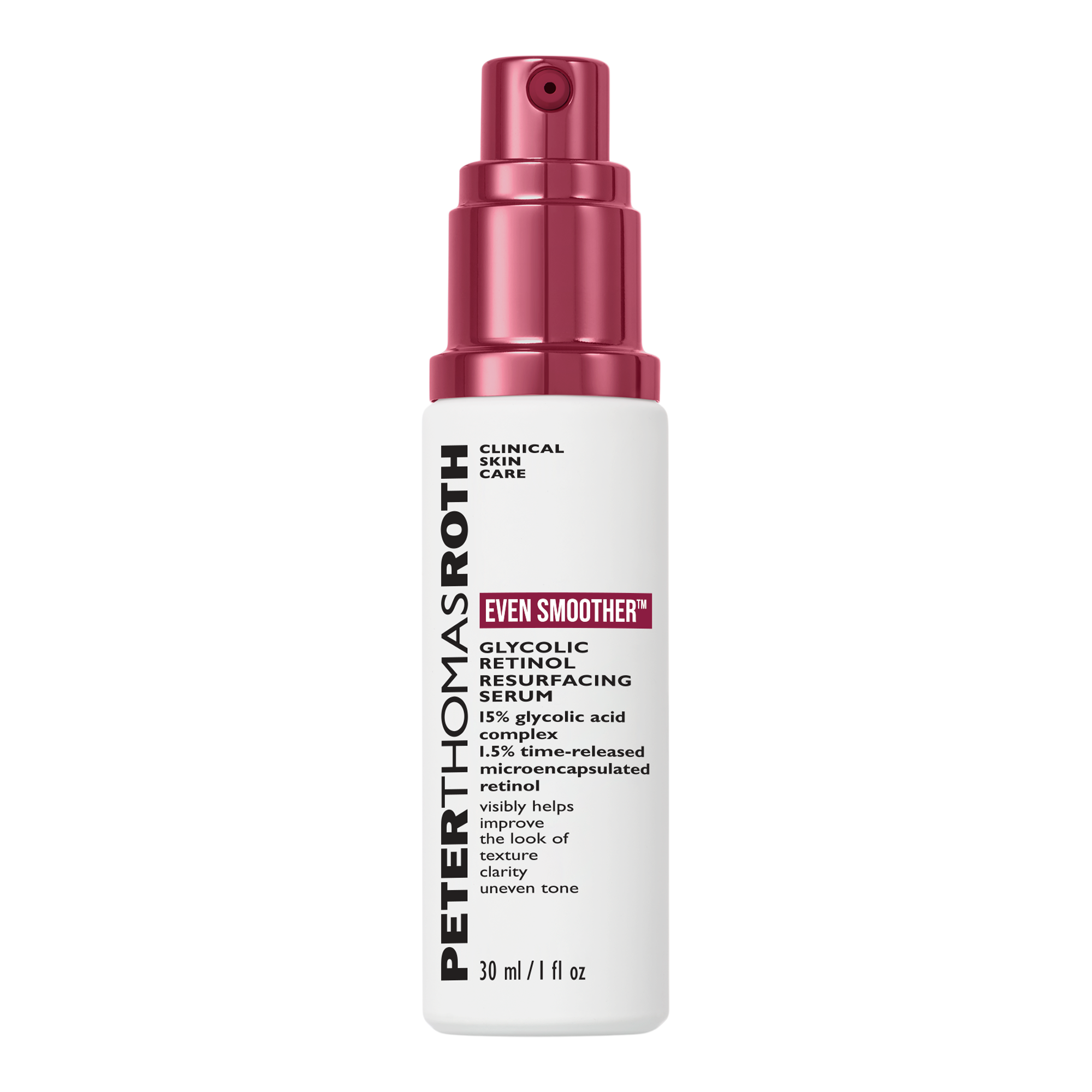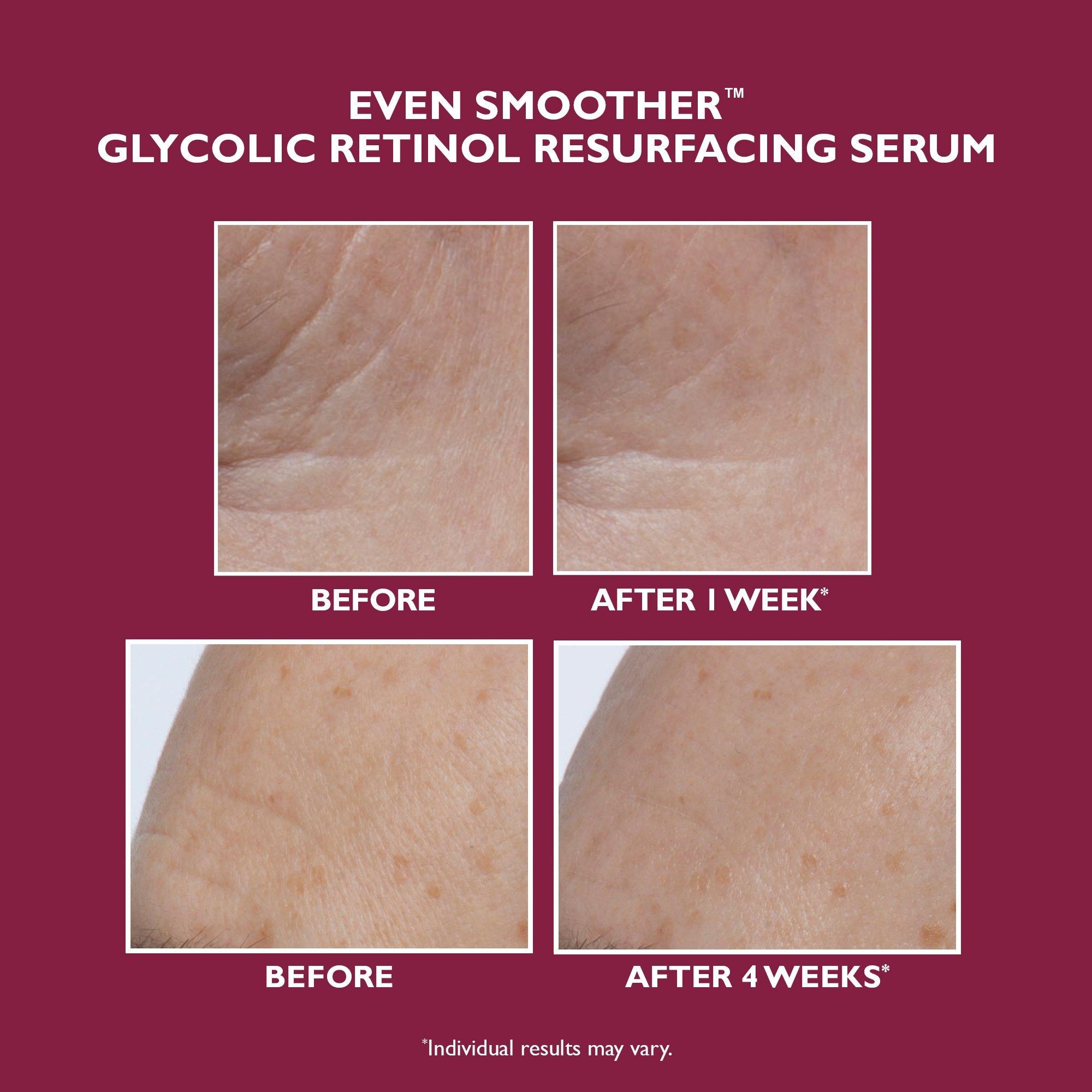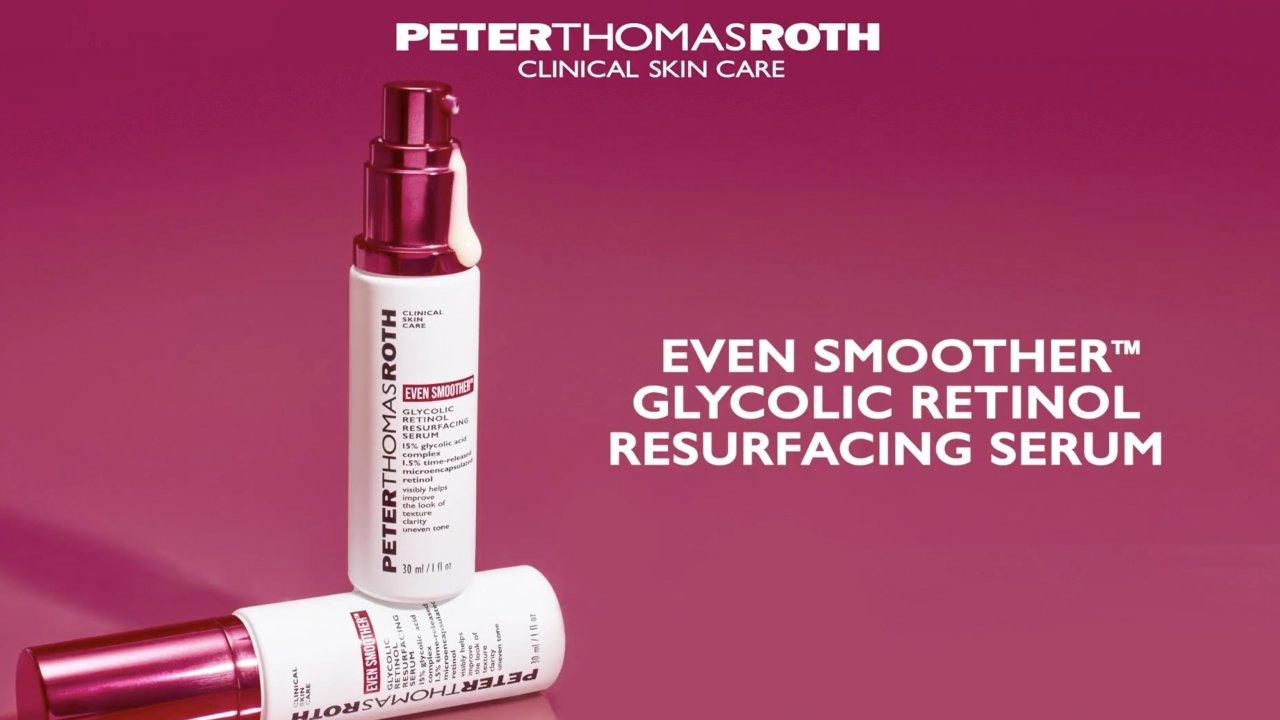 Peter Thomas Roth's Even Smoother Glycolic Retinol Resurfacing Serum is a nightly resurfacing serum with a high-potency 15% glycolic acid complex and 1.5% retinol to visibly help improve the look of texture and clarity.