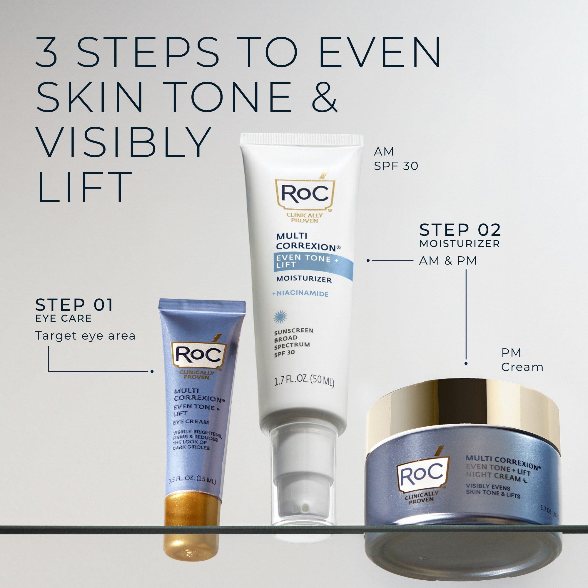 RoC Multi Correxion Even Tone + Lift 5 in 1 Daily Moisturizer with SPF 30 & Hexinol Technology improves the look of discoloration, sagging, dull tone, and wrinkles while protecting skin from future sun damage.