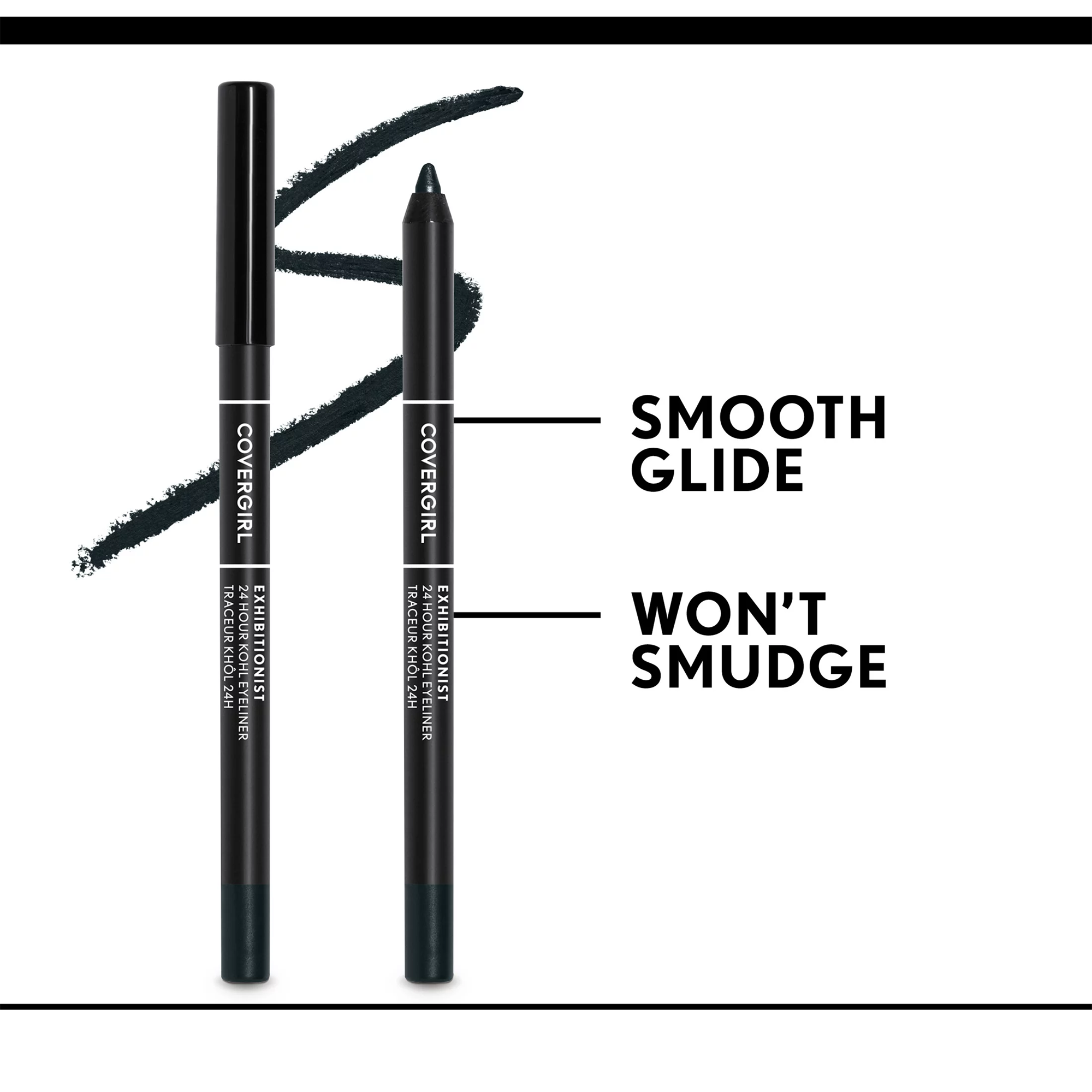 From a classic cat to a dramatic smoky, there's no eye look this smooth, creamy kohl eyeliner can't handle. COVERGIRL Exhibitionist 24-Hour Kohl Eyeliner glides on easily thanks to its gel formula and gives 24-hour wear that's waterproof, won't transfer or smudge.