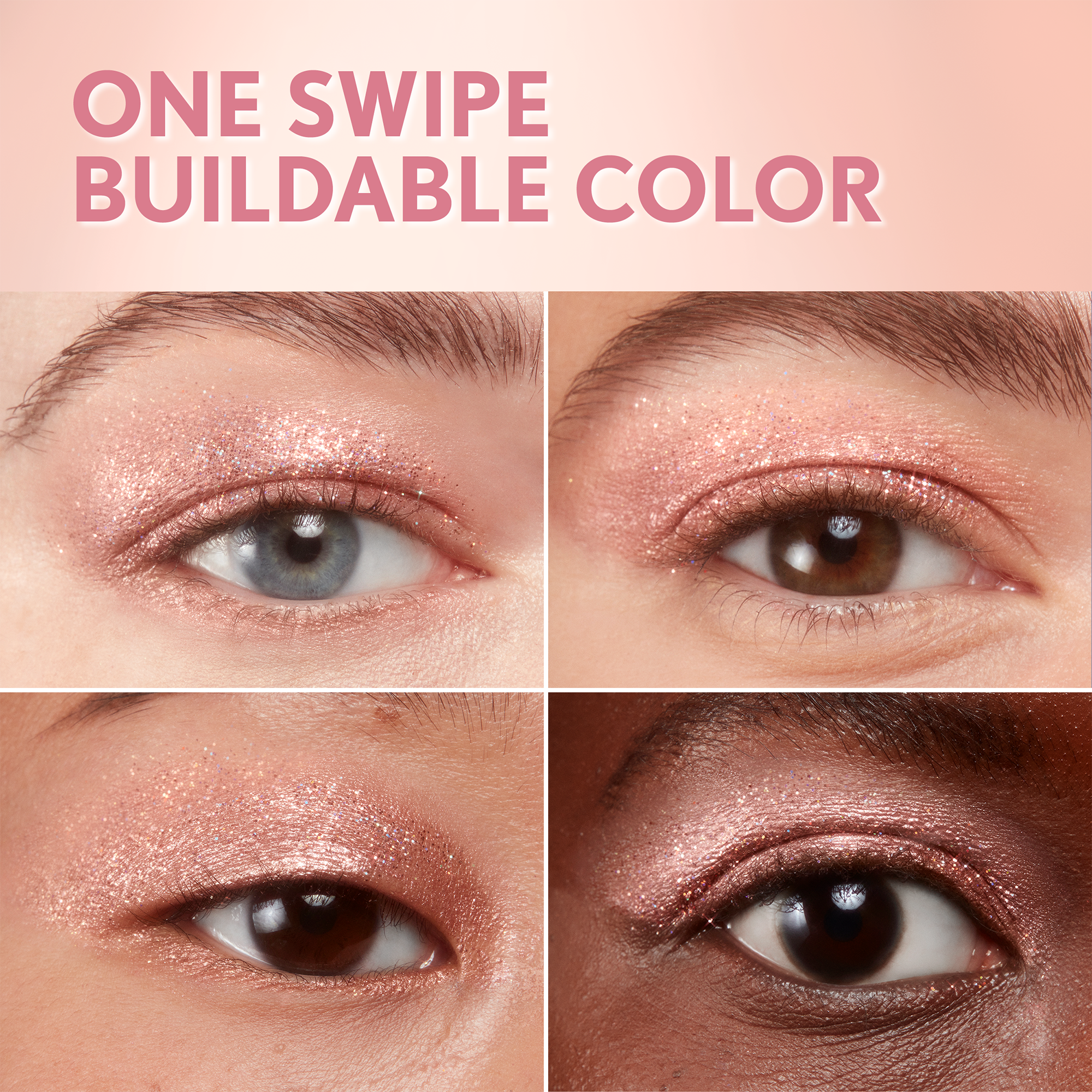 Apply liquid glitter to the eyelid with the applicator and blend using your fingertips or a flat eyeshadow brush. Wear alone or as an eyeshadow topper to amplify your eye look.