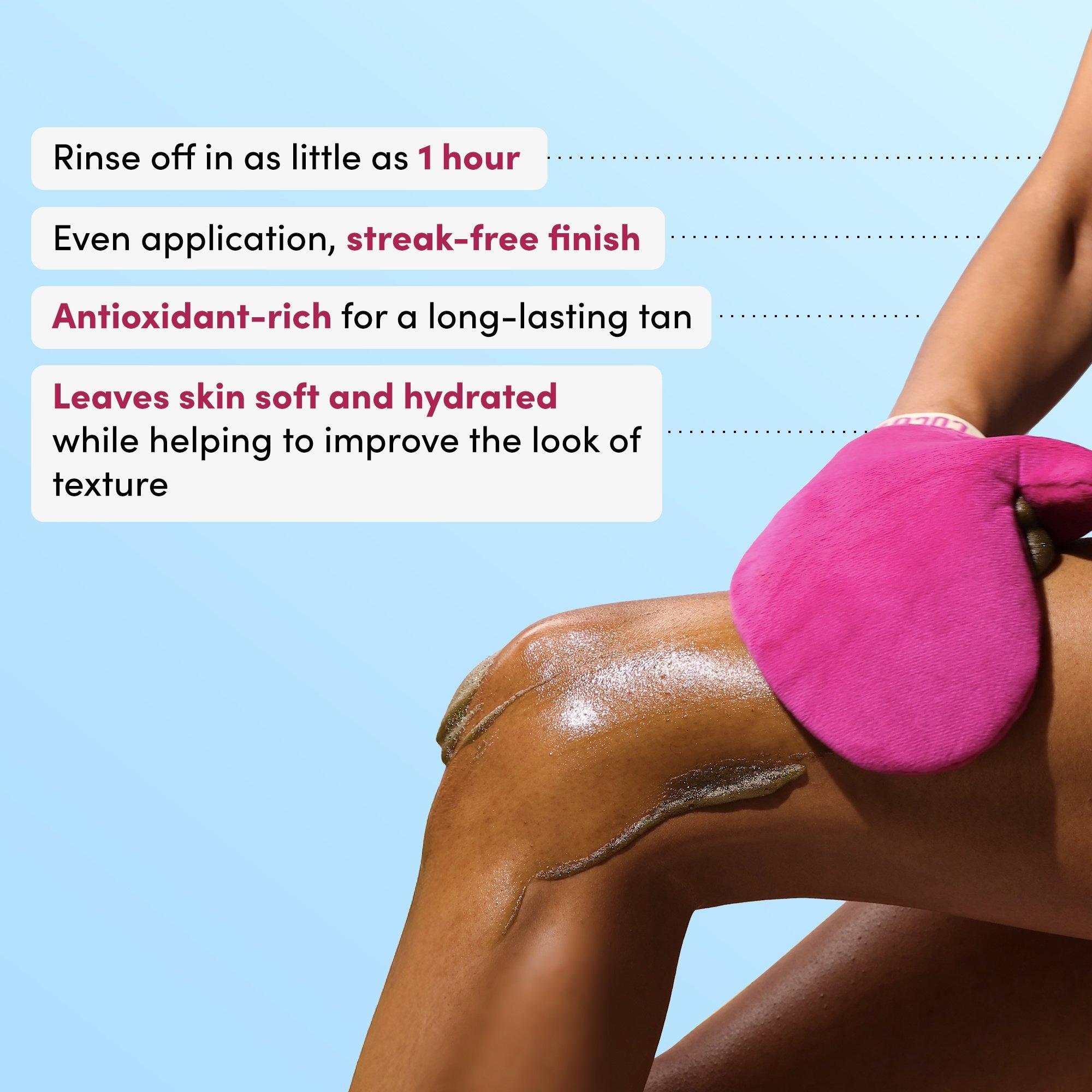 4. Rinse off after 1 hour and gently pat skin dry (the tan will continue to develop over 24 hours).