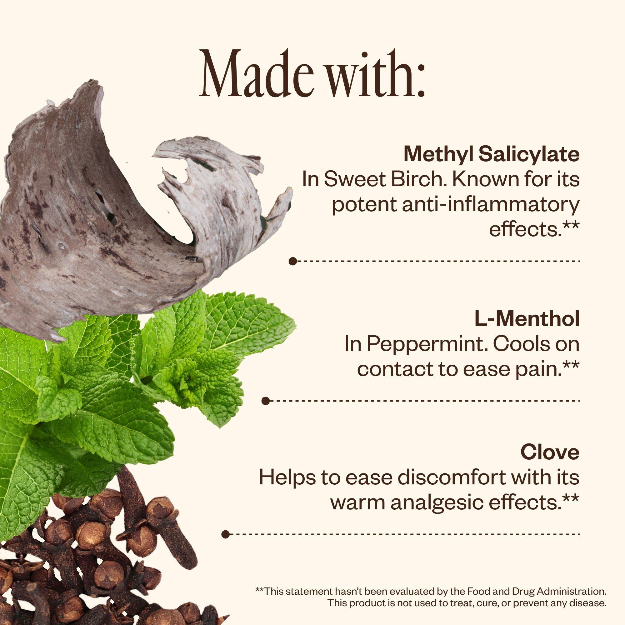 • A blend of L-Menthol from Peppermint and Methyl Salicylate from Sweet Birch acts as an analgesic to numb pain and provide relief.