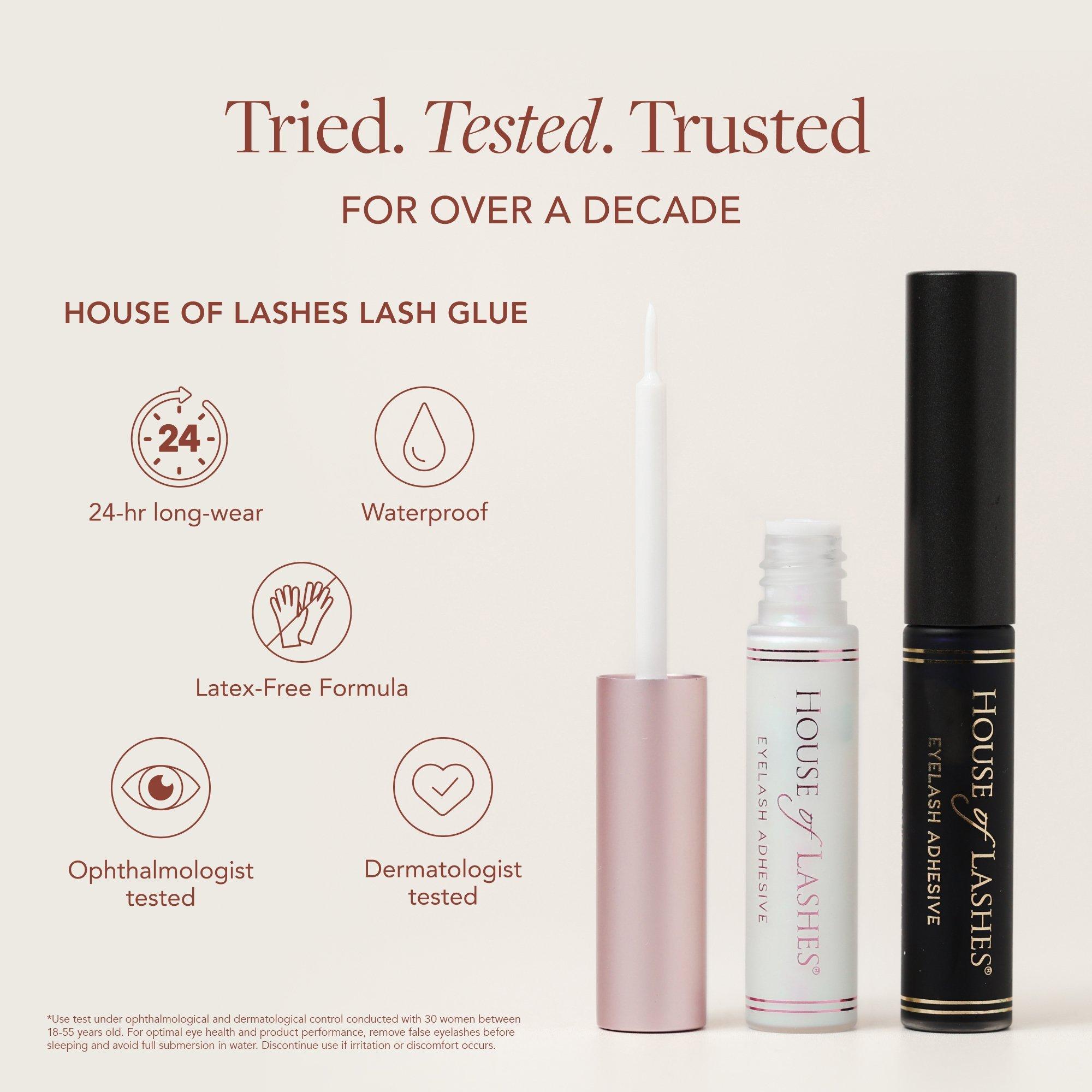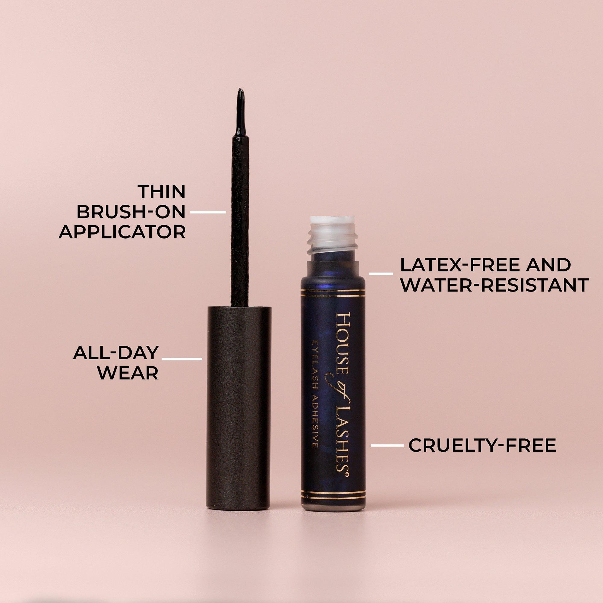 House of Lashes Eyelash Adhesive for Strip Lashes latex-free, water-resistant formula for long-lasting wear, perfect for those with latex sensitivity or contact lenses. Designed with its own unique bottle and brush-on applicator for easy and precise application.