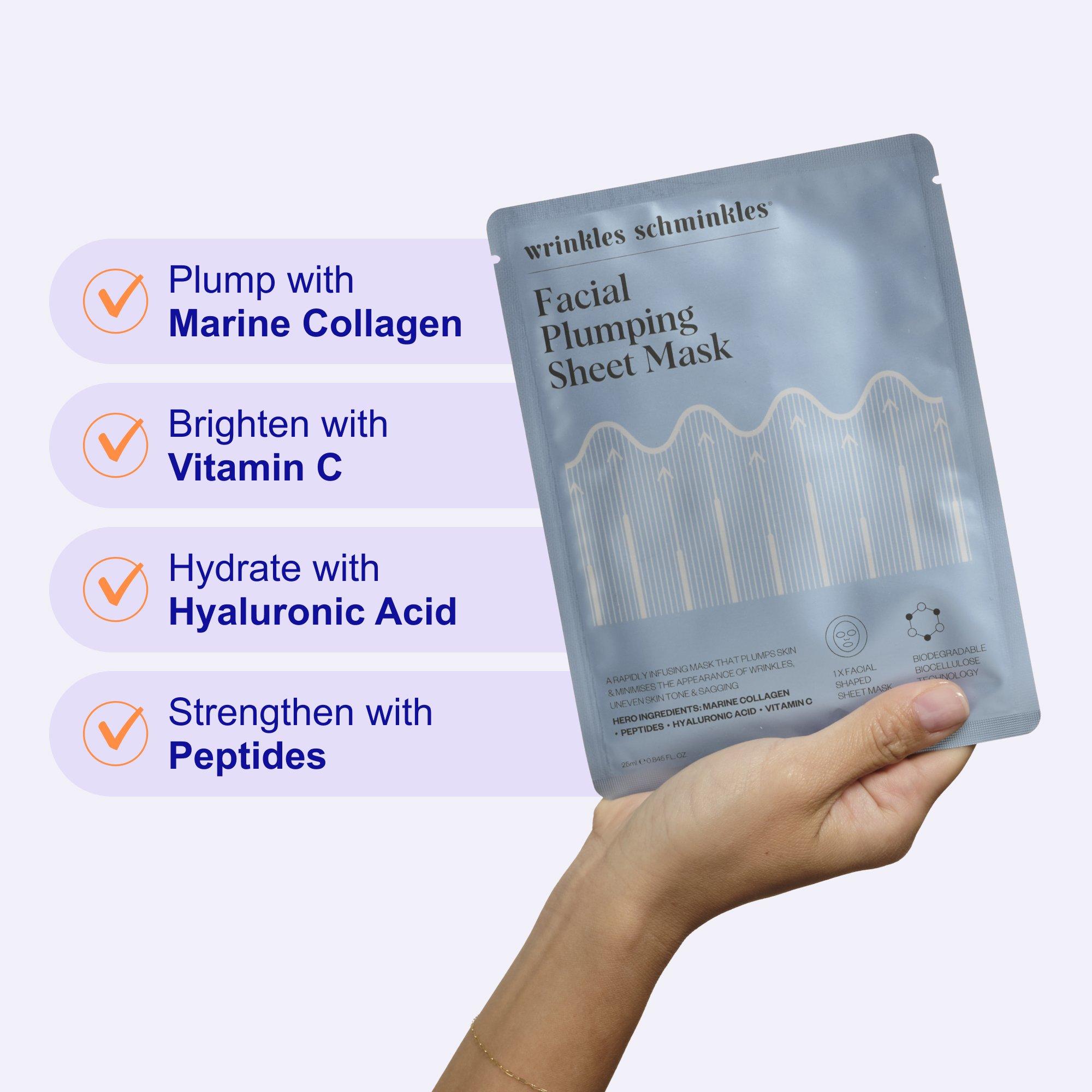 Wrinkles Schminkles Facial Plumping Sheet Mask delivers 25ml of powerful serum in just 15 minutes. Packed with collagen, peptides and antioxidants to hydrate, plump and repair. Made from biodegradable biocellulose for a second-skin fit and fast absorption.