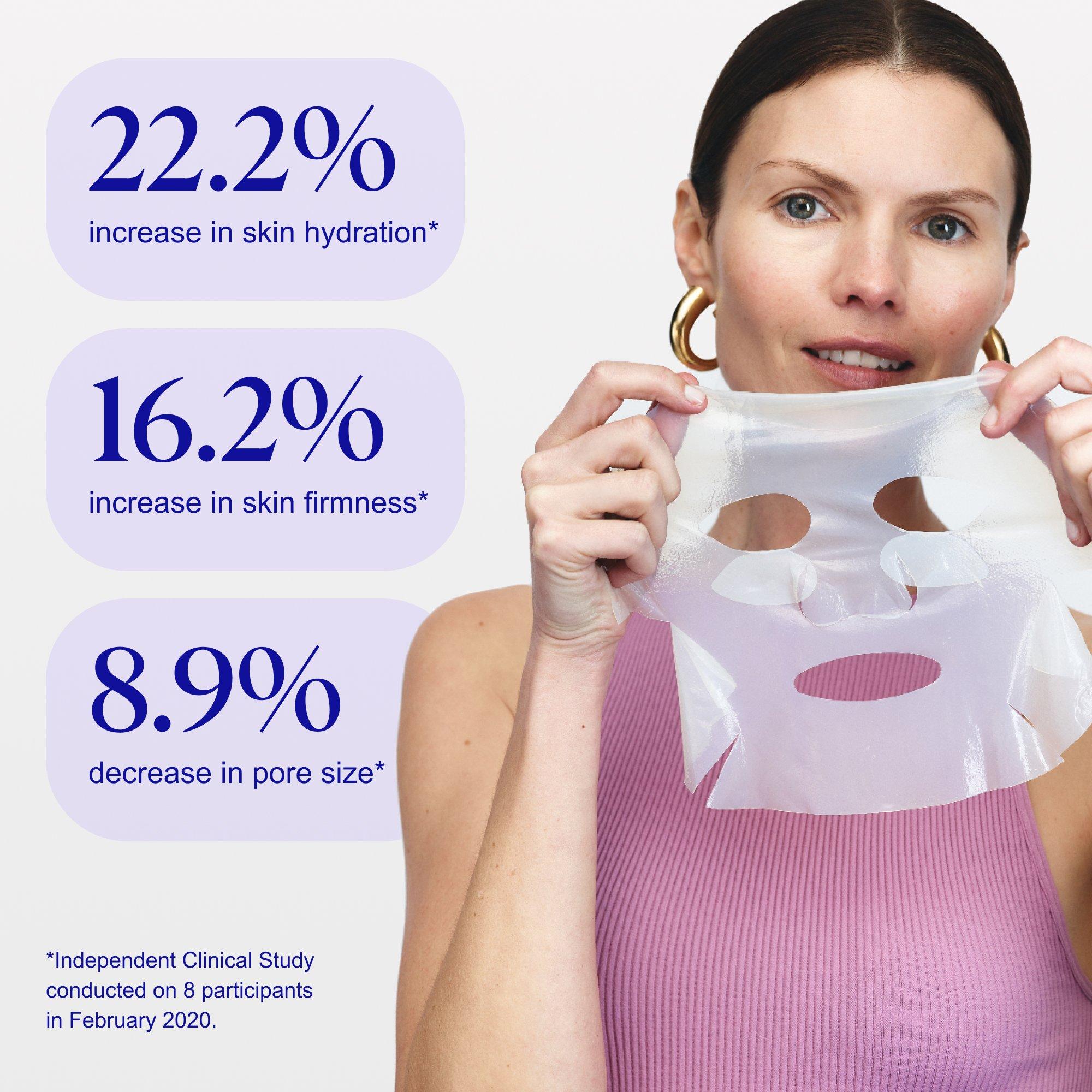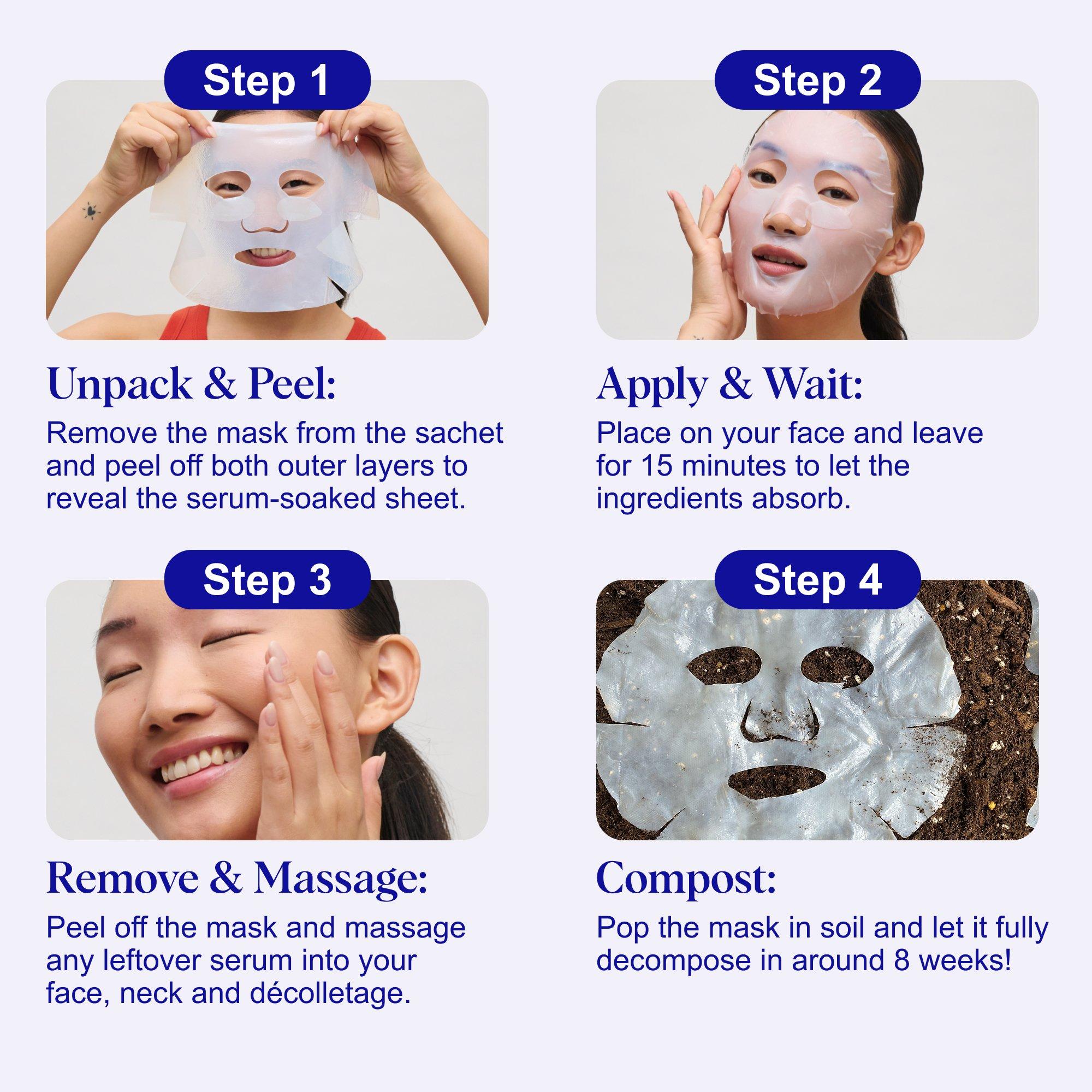 • Remove & Massage: Peel off the mask and massage any leftover serum into your face, neck and décolletage.