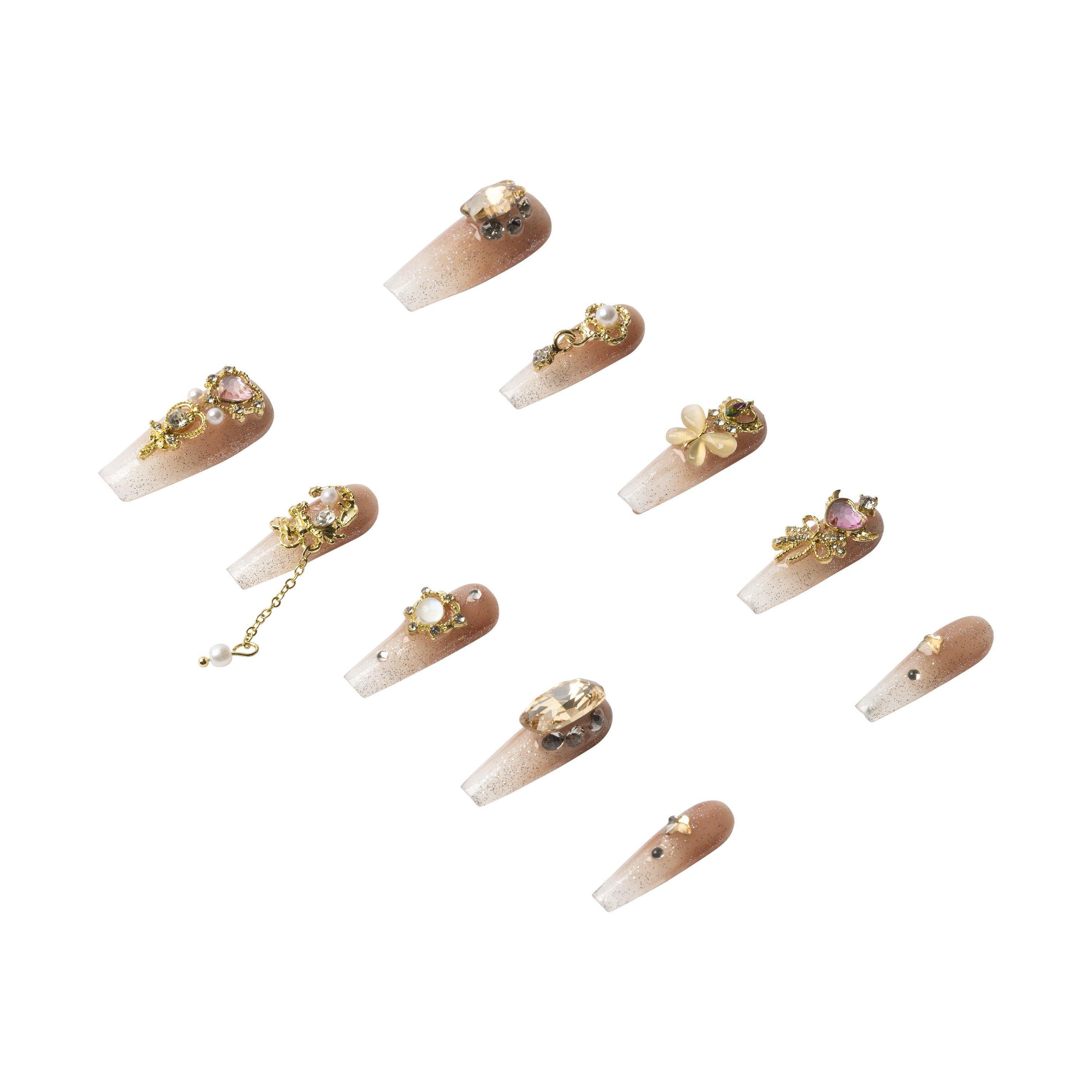Shimmering ombré nails with 3D gold charms, pearls, butterflies, and heart details. A bold yet dreamy design crafted from high-quality materials. Handmade and reusable for an elevated look.