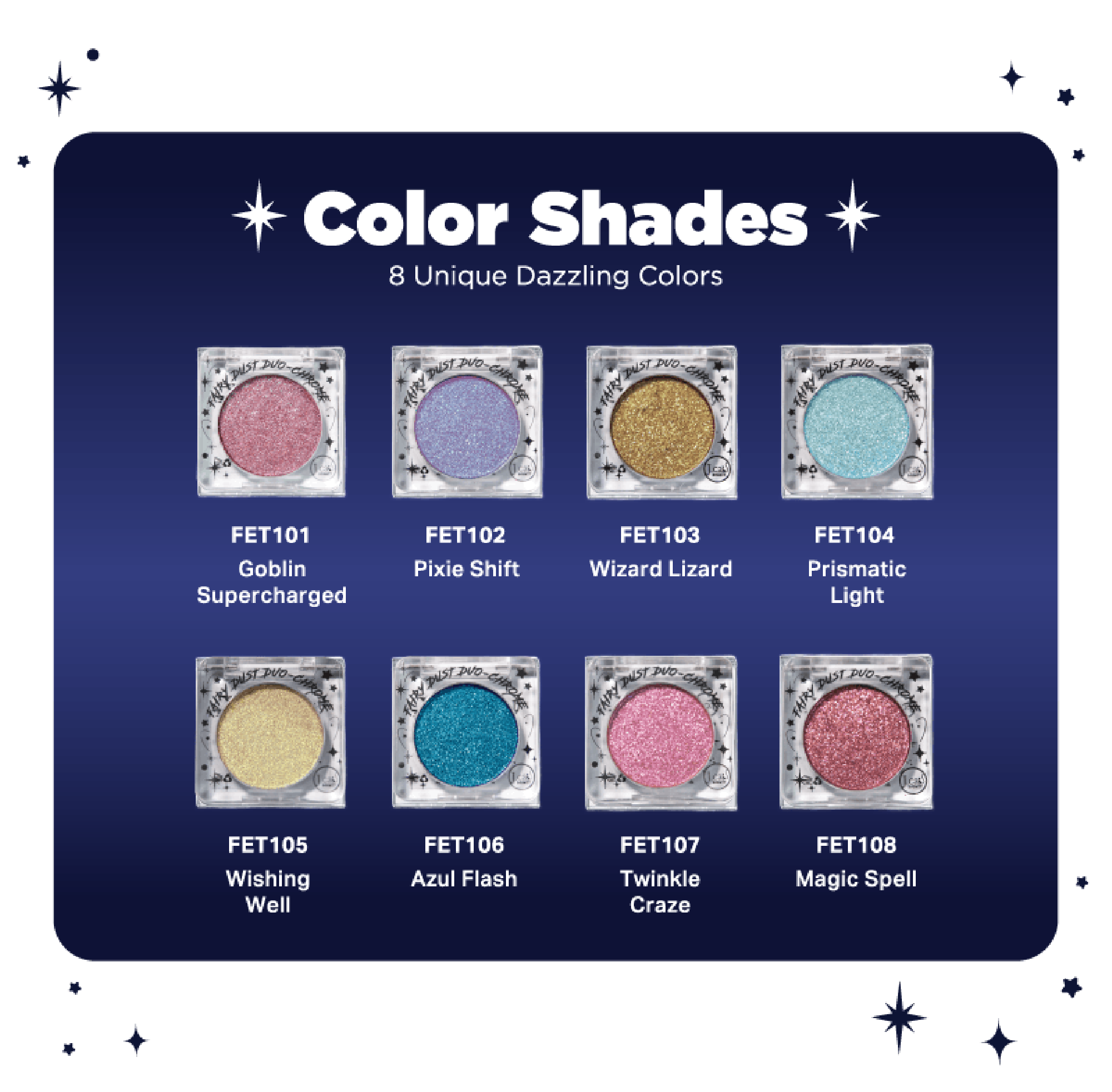 J.Cat Beauty Fairydust Duo Chrome Eye Topper delivers a dazzling effect with its sparkling, multidimensional finish. Perfect for adding a touch of glamour and shine to your eye look, this eye topper is a must-have for an eye-catching appearance.