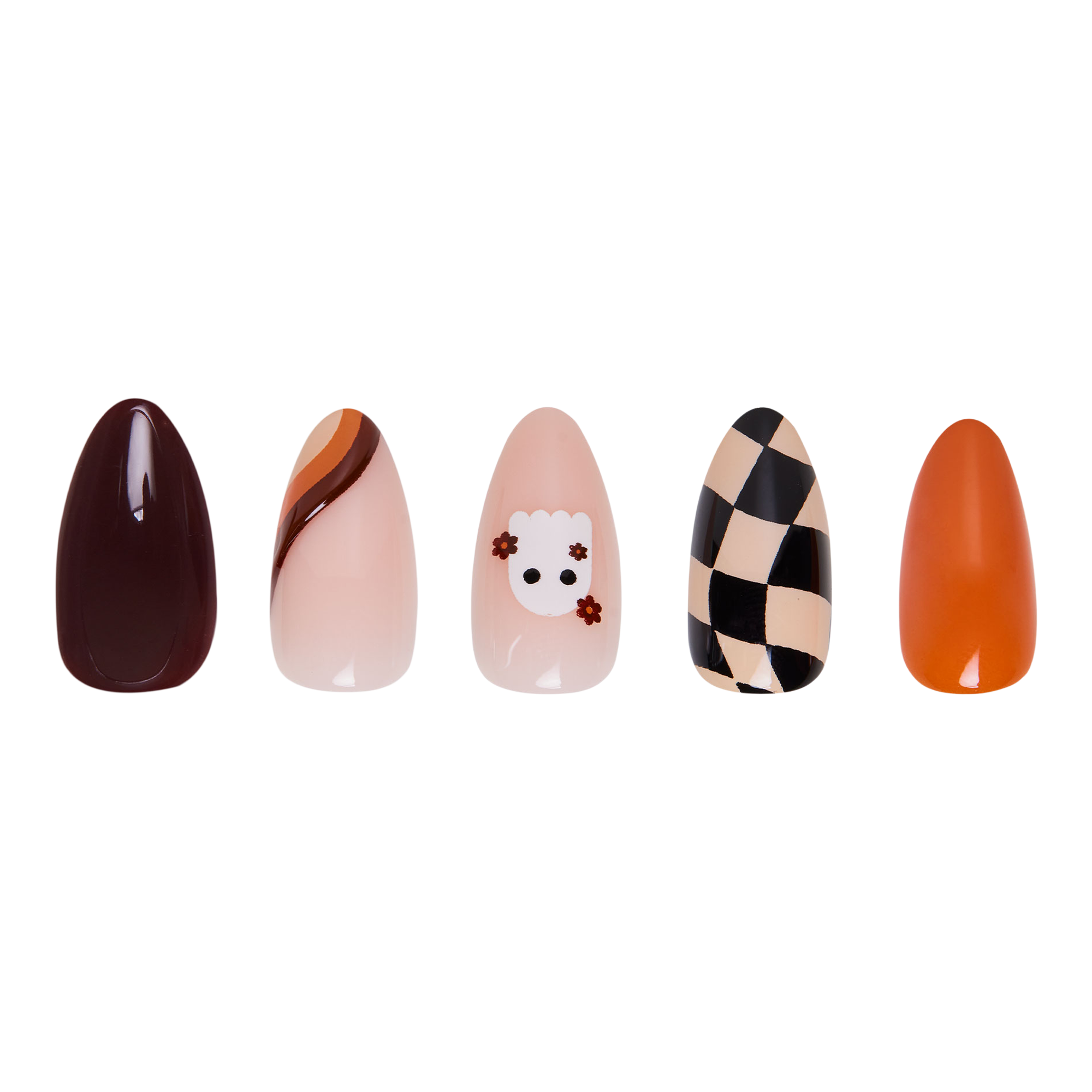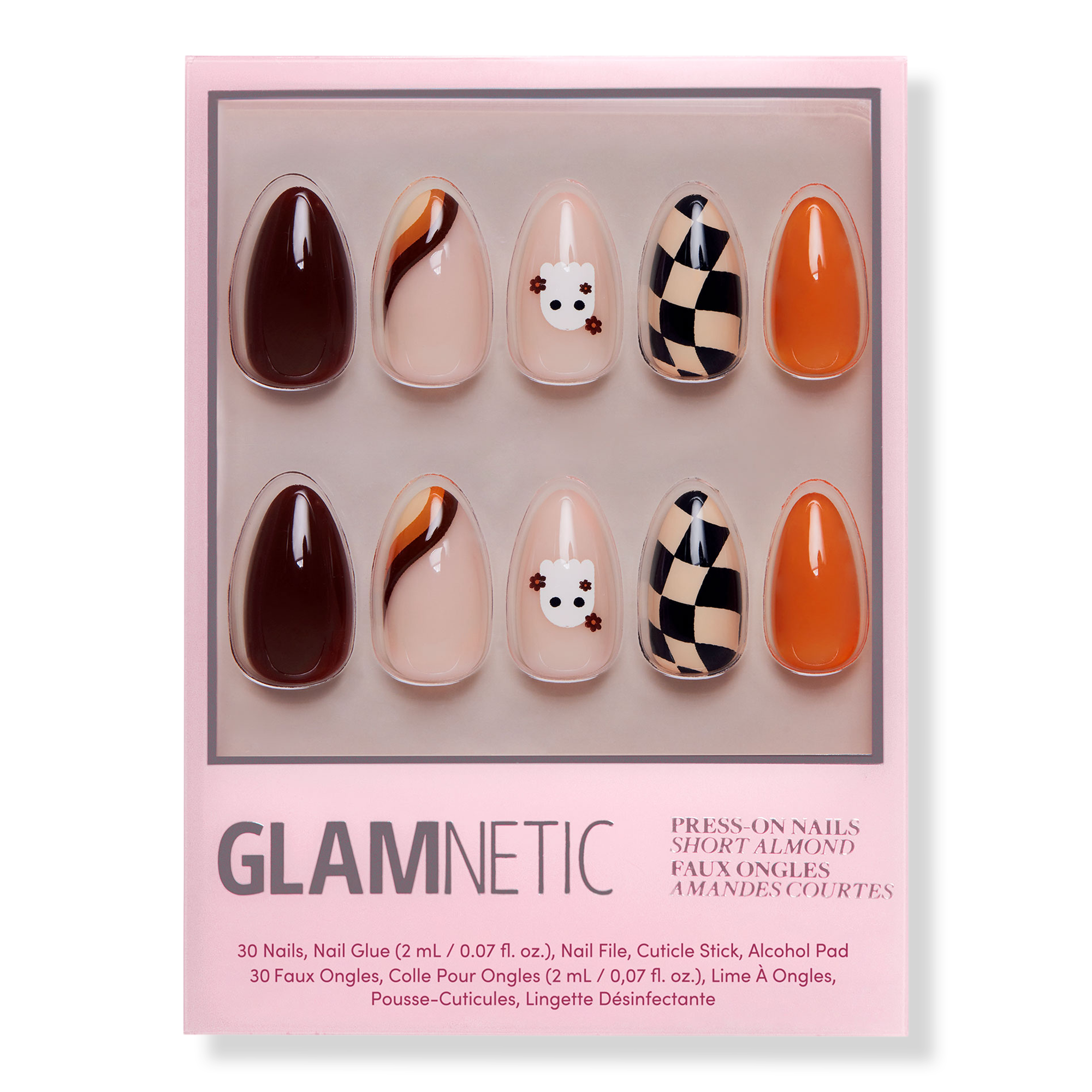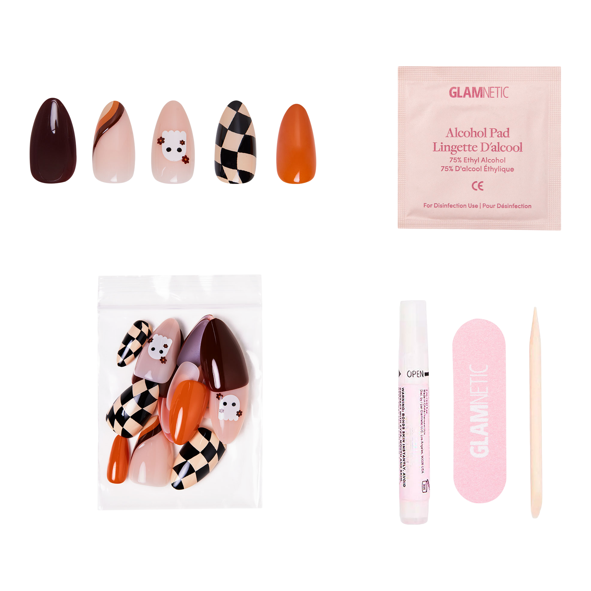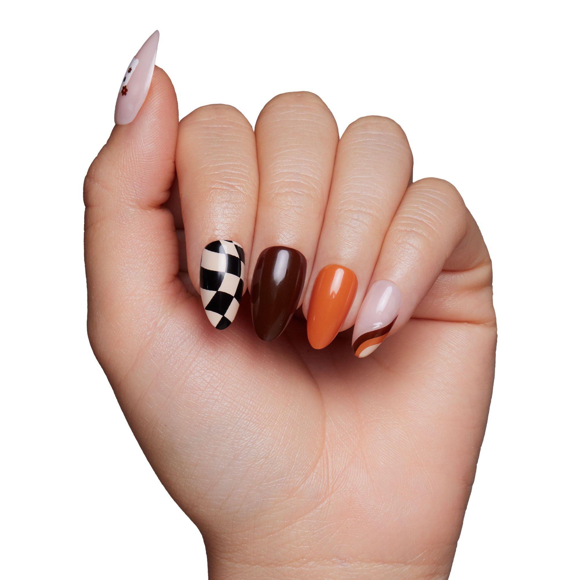 Embrace the spookiest of vibes with Glamnetic's Fall Boo Nail Set! These short almond-shaped nails are designed to bring a fun yet chic touch to your Halloween look. Featuring a palette of warm, earthy tones and playful graphic accents, this set is your go-to for all the fall festivities.