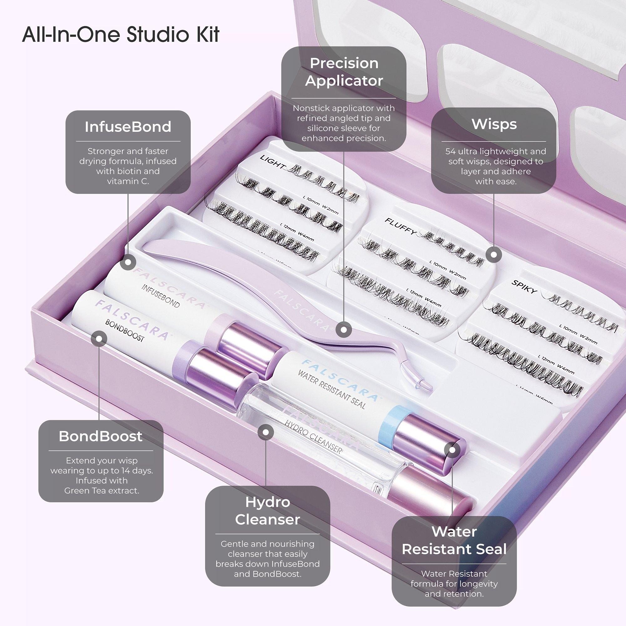 Craft your dream lashes with greater variety & customization to achieve a new level of advanced lash artistry at home with Kiss's Falscara Studio Lash Extension Kit. Stack, mix, & match 3 wisp designs, 3 band widths, & 3 lash lengths for limitless lash extension styles that last up to 14 days.