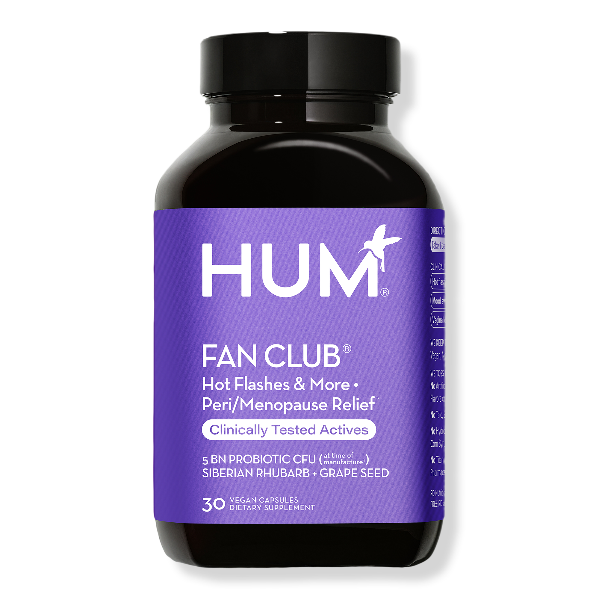 HUM Nutrition Fan Club for Multi-Symptom Relief for Peri/Menopause is an estrogen-free, non-hormonal, clinically-studied probiotic formula that addresses 11 symptoms of perimenopause and menopause featuring Siberian rhubarb, patented probiotics and grape seed extract.