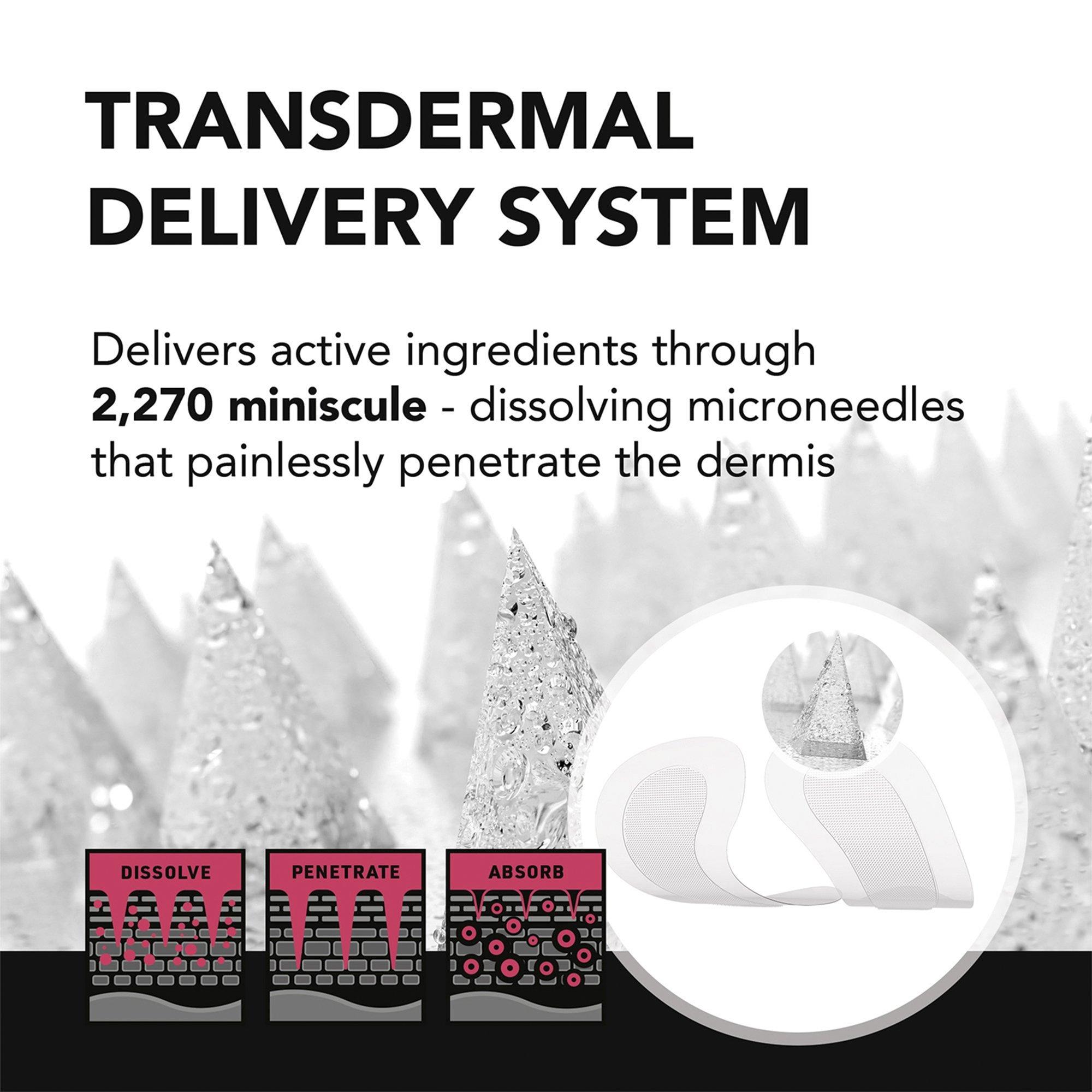 Seeded by 2,270 dissolving microneedles, the anti-aging miracle patches dissolve a potent Hyaluronic Acid complex into the skin to help firm, plump, and smooth the eye area while you sleep - Clinically proven to improve skin firmness and the appearance of wrinkles after just 2 weeks.