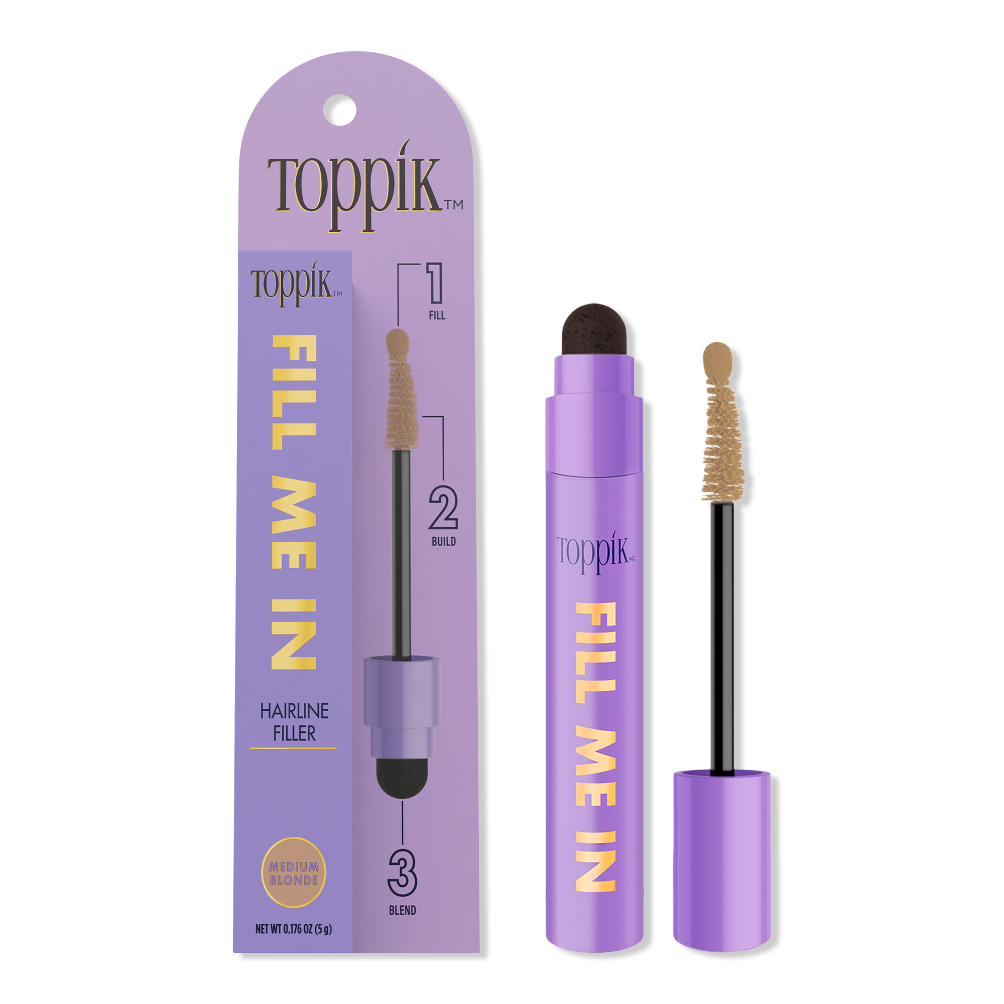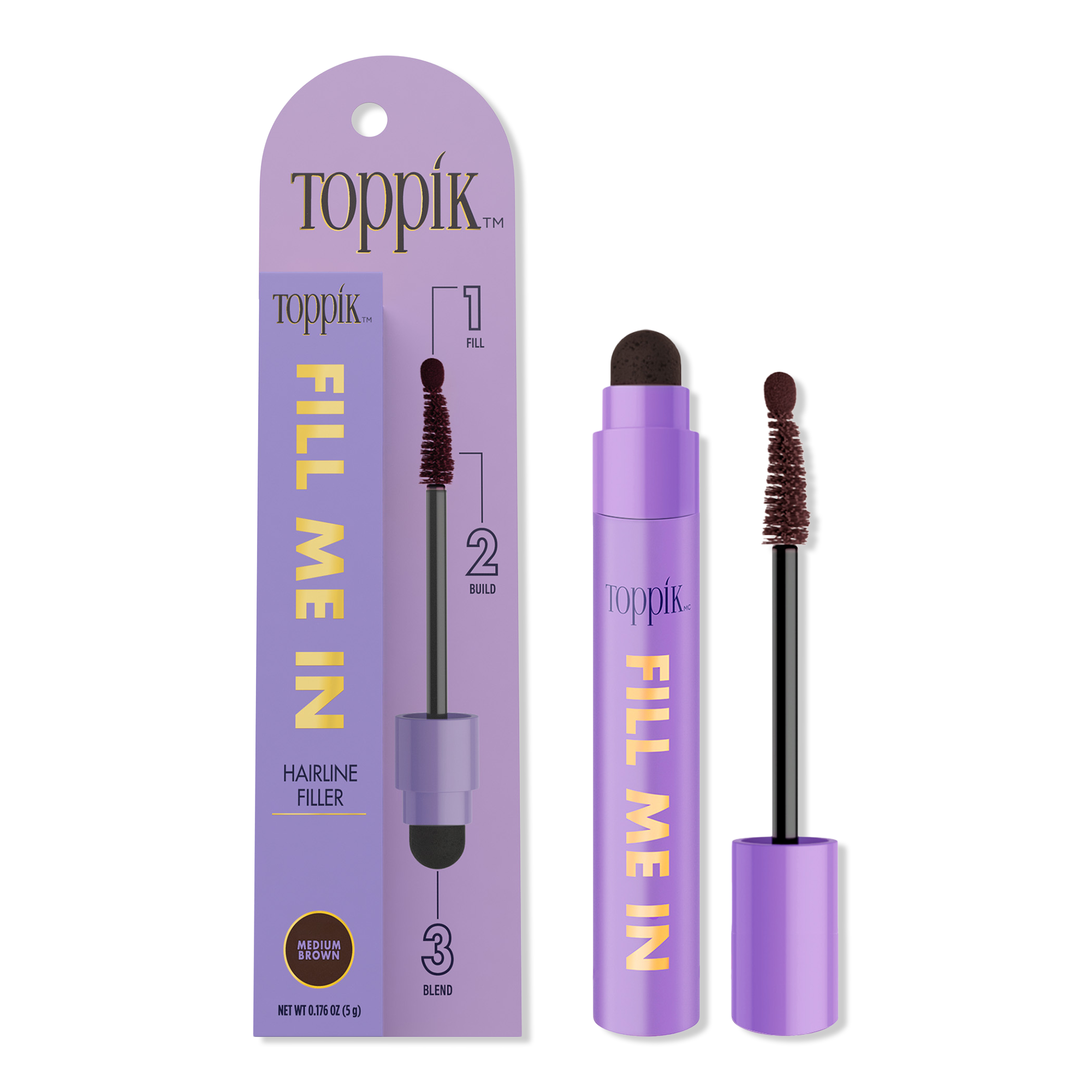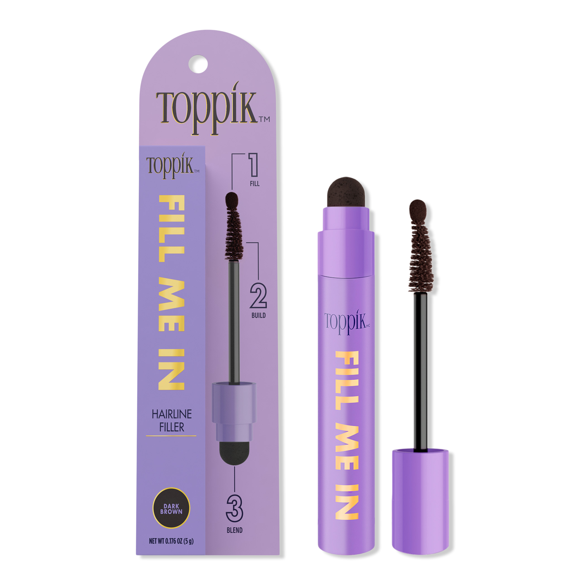 Toppik Fill Me In Hairline Filler is a long-lasting, durable formula designed to fill, build, and blend sparse areas with one mess-free, easy-to-use tool.