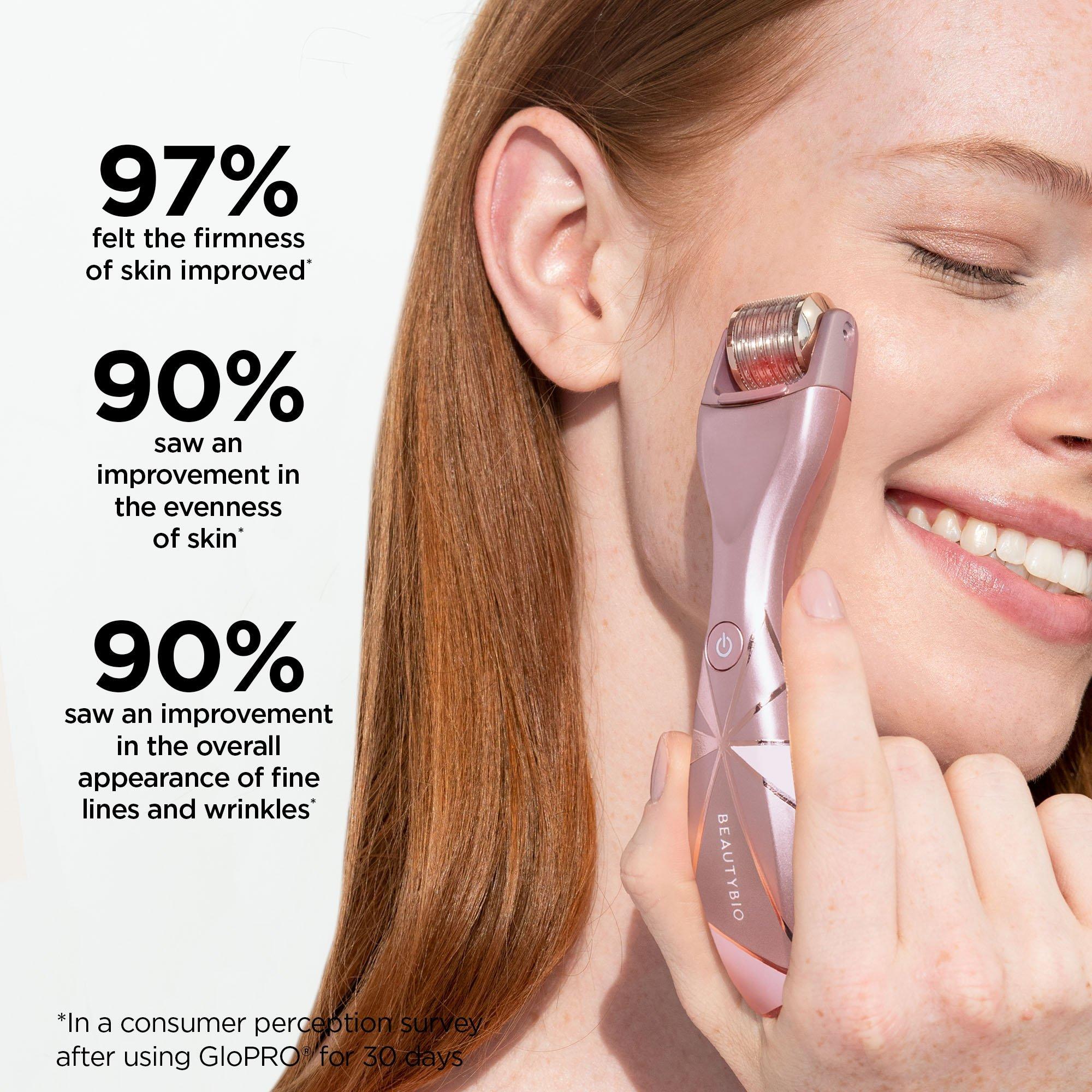 BeautyBio's Firm and Glow GloPRO Set features the award-winning GloPRO microneedling tool, Skin Prep Pads, FACE MicroTipTM Attachment, and Pack N' Glo case. Enhance the benefits of skincare products for visibly firmer, smoother skin while targeting fine lines, uneven texture, and enlarged pores.