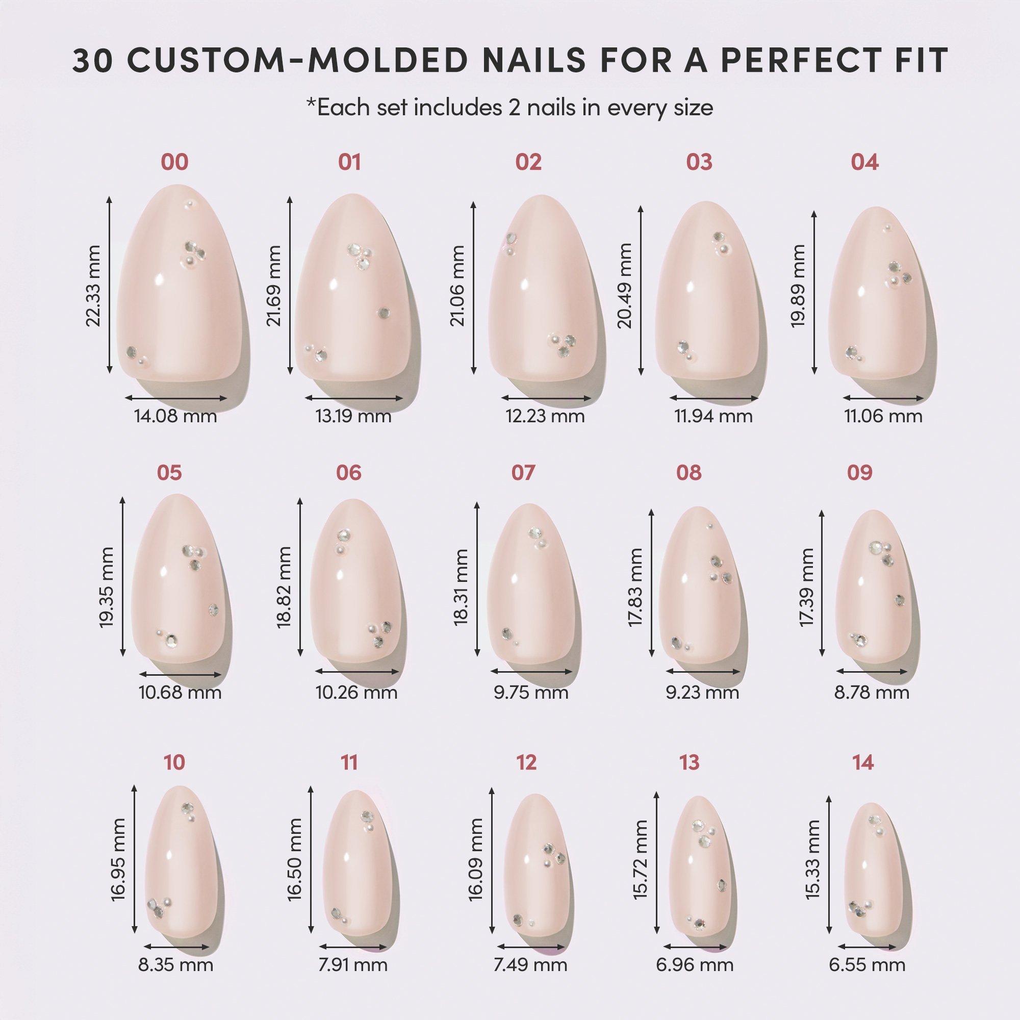 When it comes to Glamnetic's First Dance Press-On Nails set, there are lots of reasons to celebrate. Designed with a dreamy nude base and a soft, glazed finish, these short almond nails are decorated with delicate 3D pearls and gem accents. Effortlessly cool, and endlessly chic.
