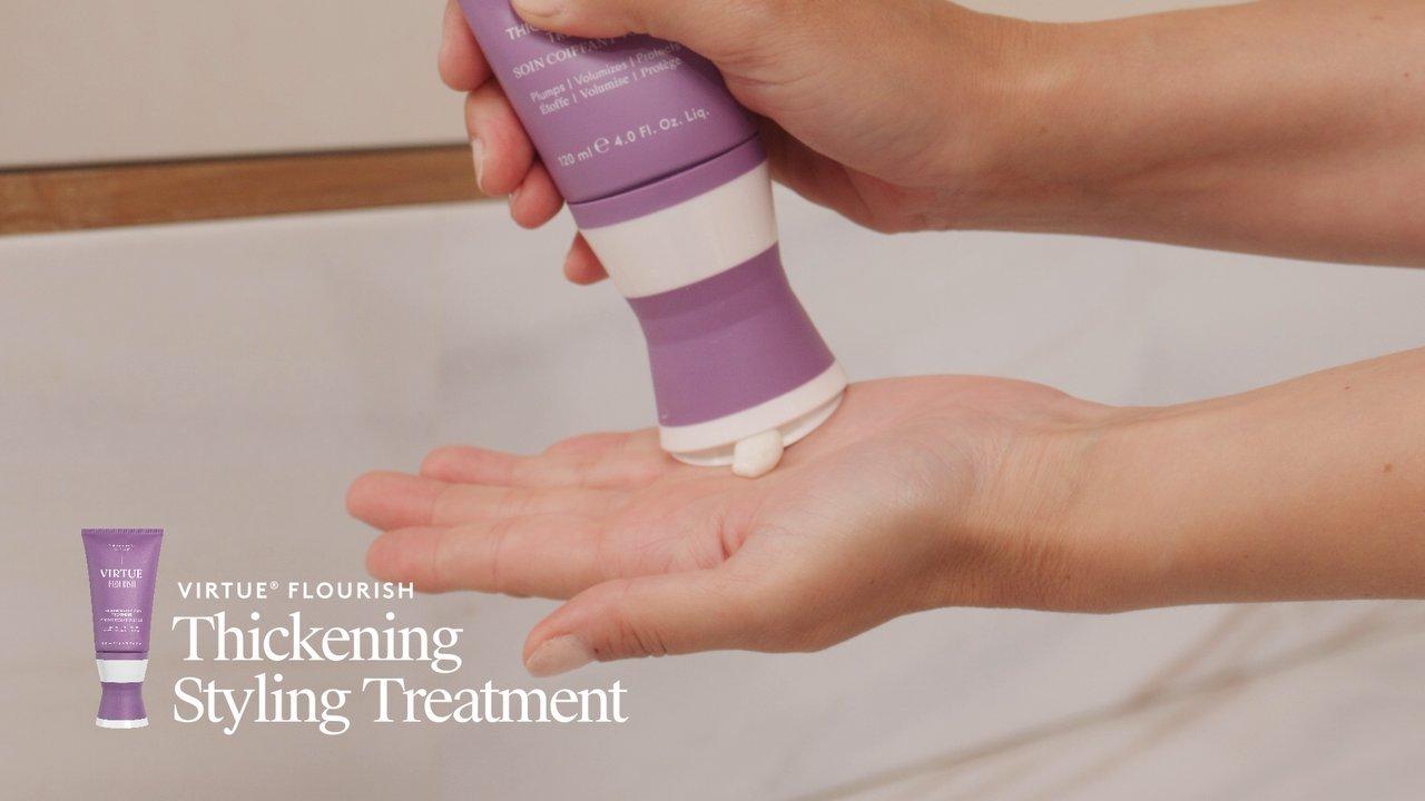 Virtue Flourish Thickening Styling Treatment immediately plumps each individual strand for instant thickness and all-day volume that accumulates with each use, creating sustained body and fullness.