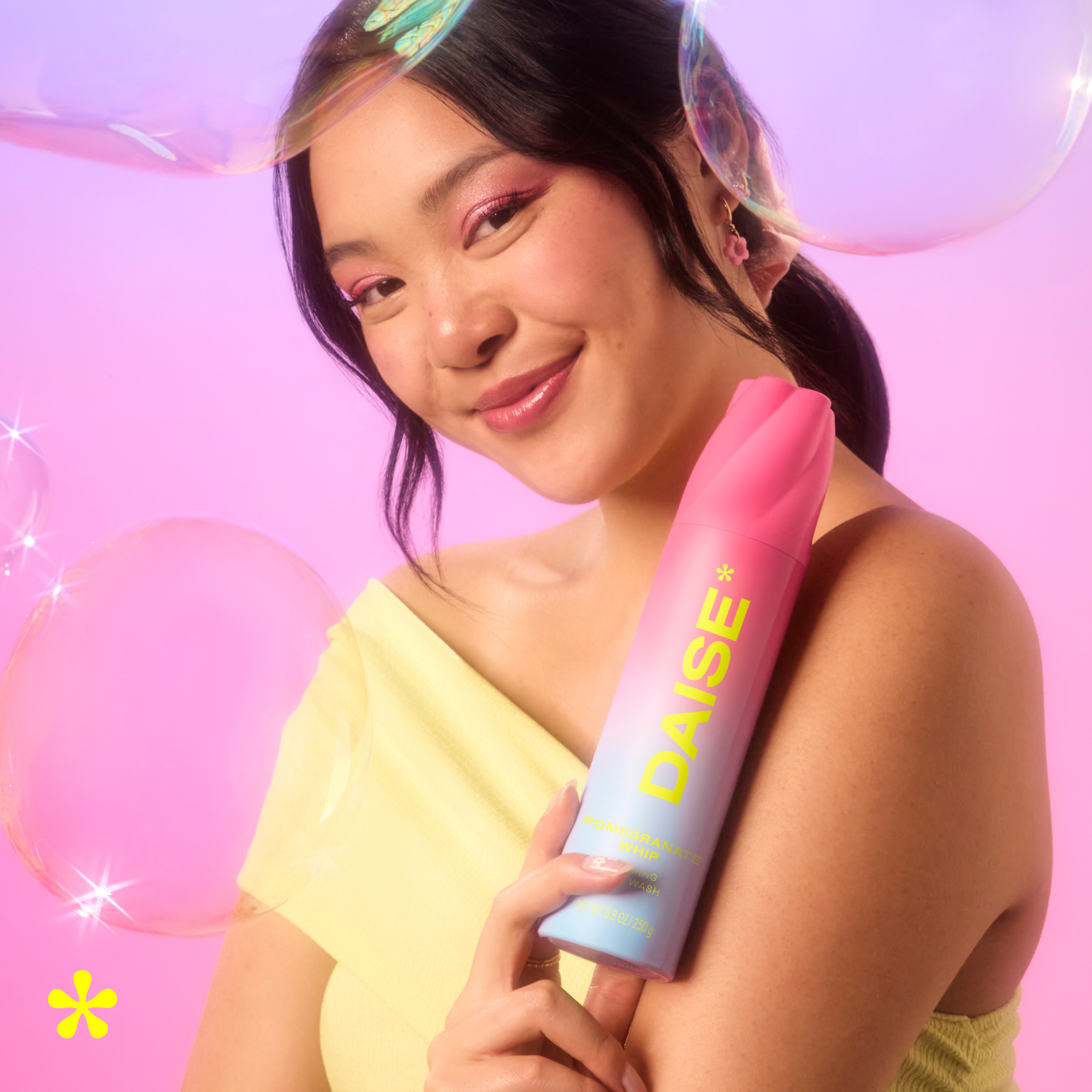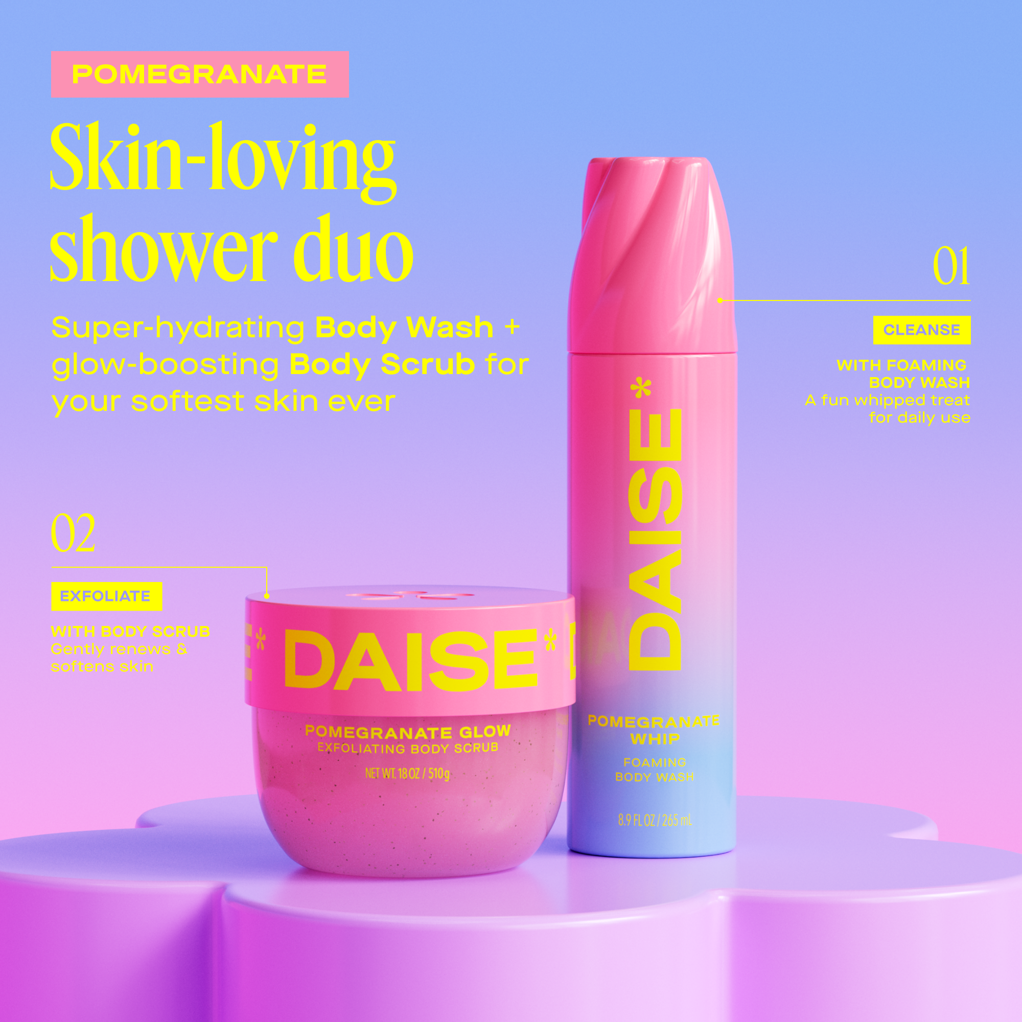 Shake well. Turn the bottle upside down and spray foam in the palm of your hand. Apply to body, lather and rinse well. Pair with DAISE Exfoliating Body Scrub for the ultimate bath or shower routine.