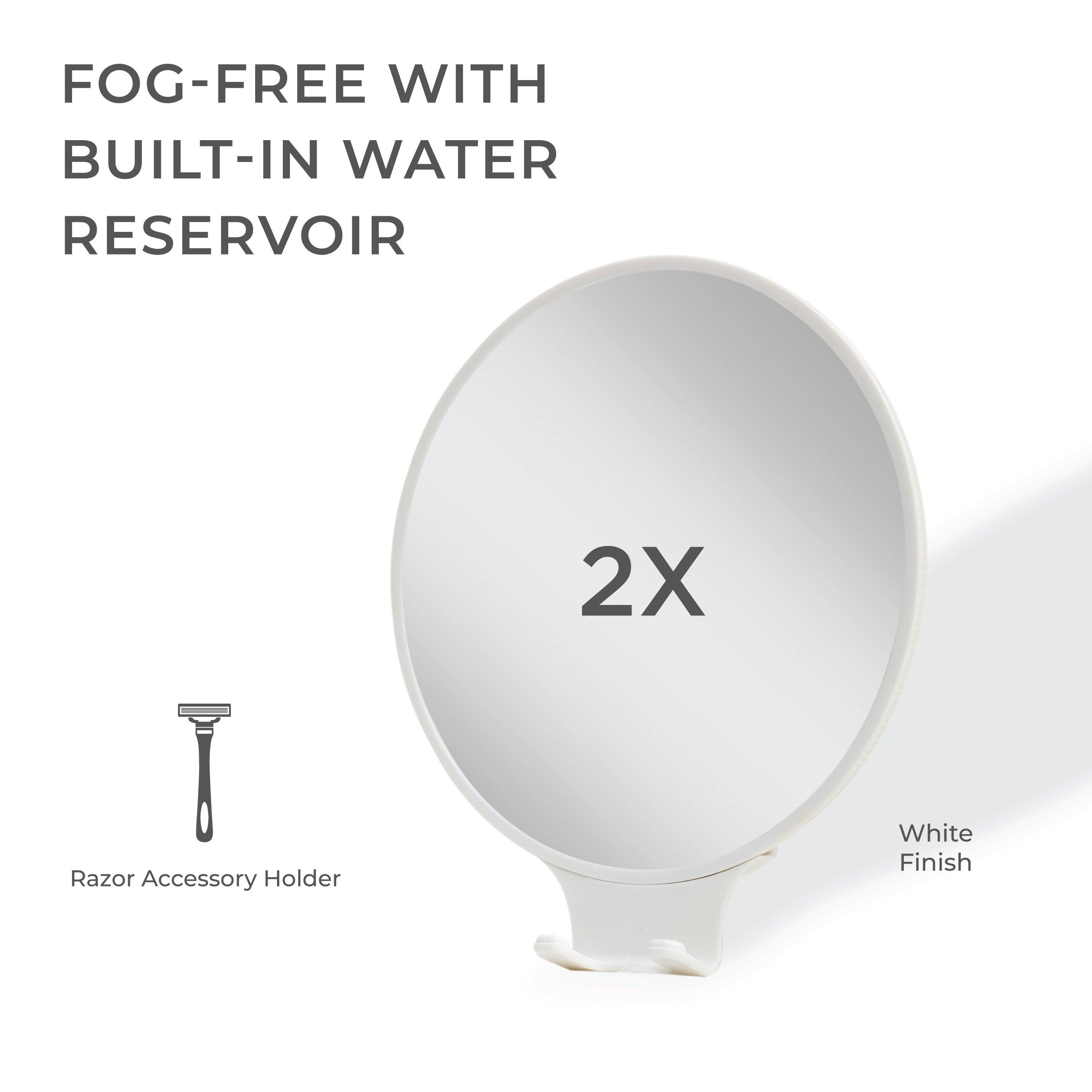This fogless mens shaving mirror for the shower features 2-times magnification, without lights. 7-inches tall, it includes a built-in razor holder ensuring convenience, and mounts easily on smooth surfaces.