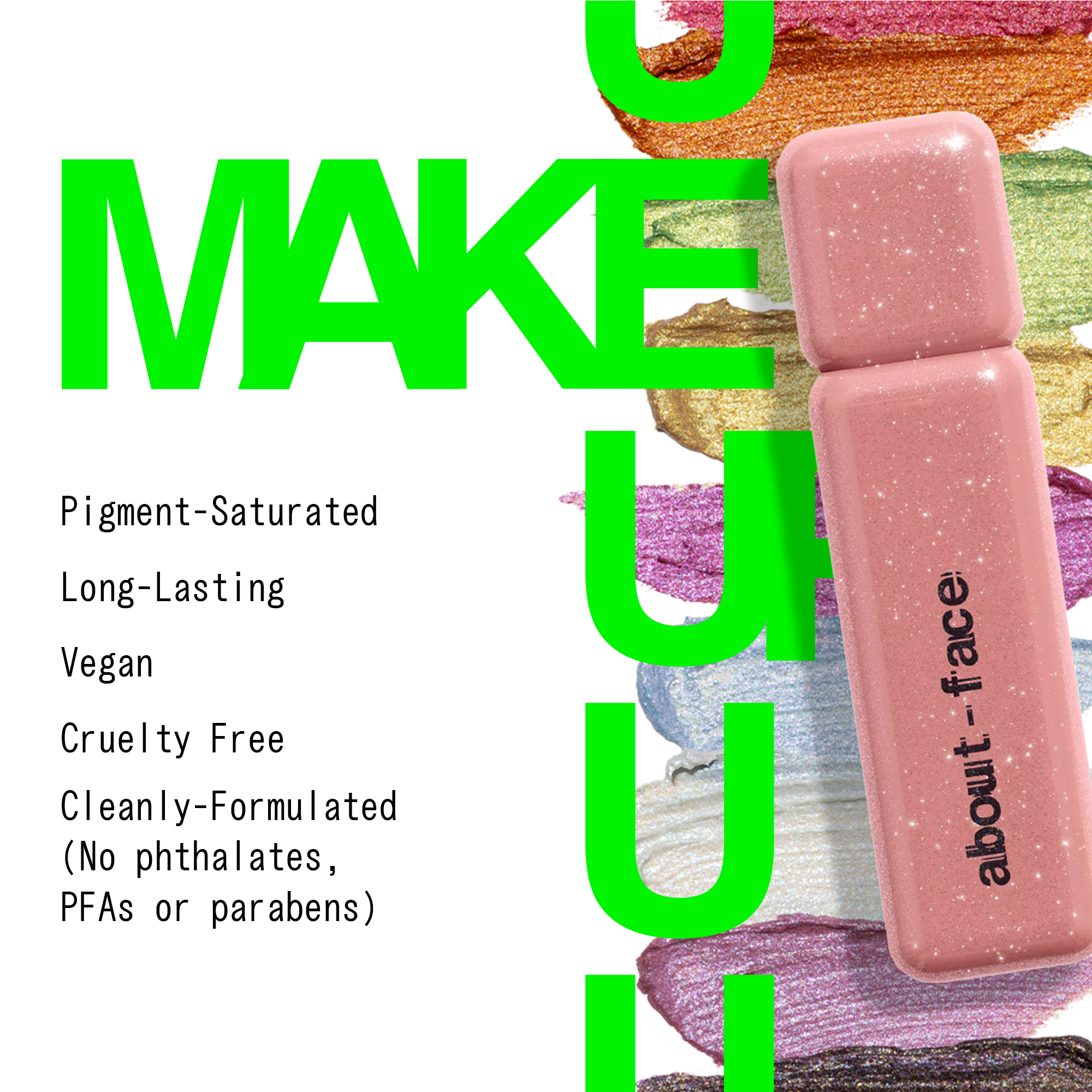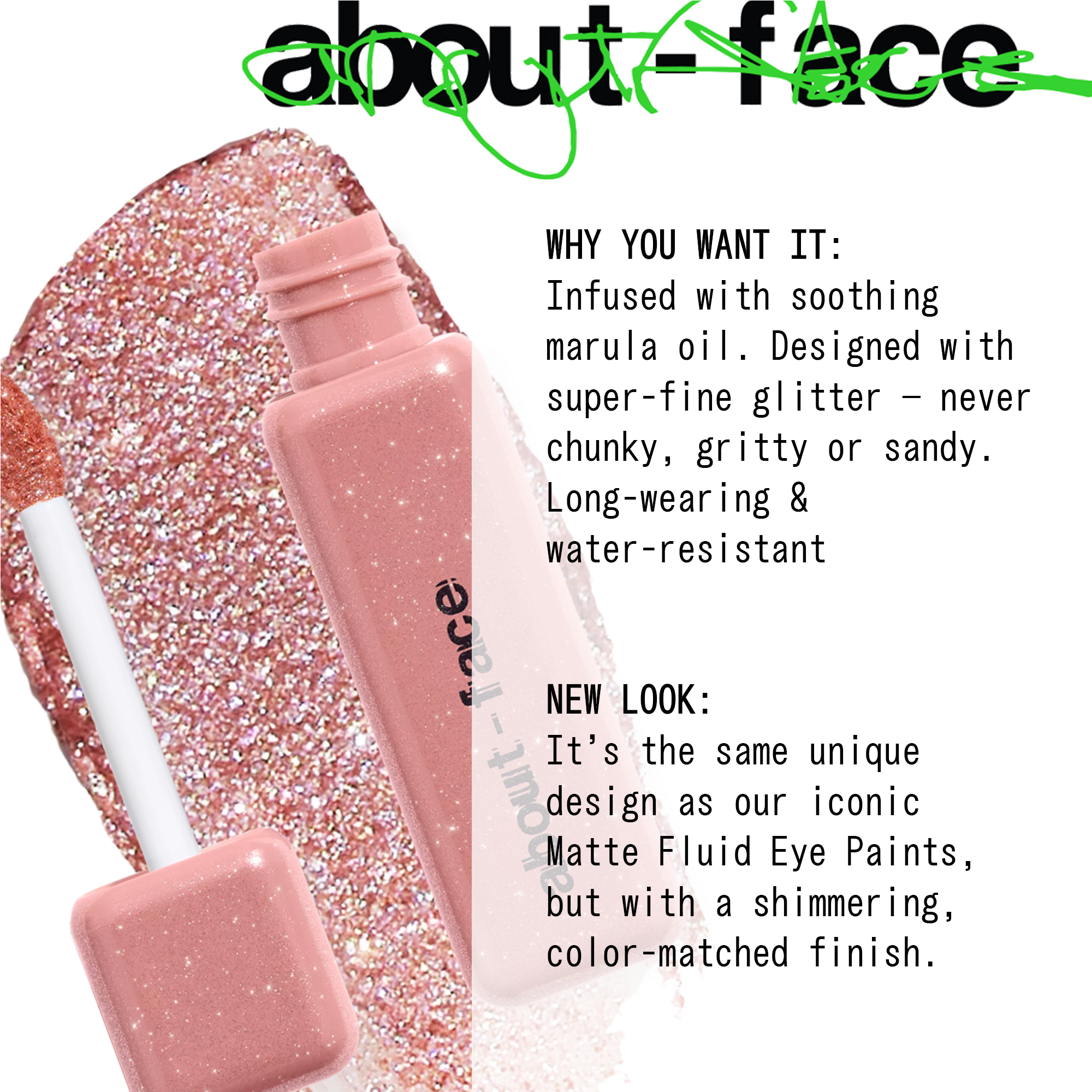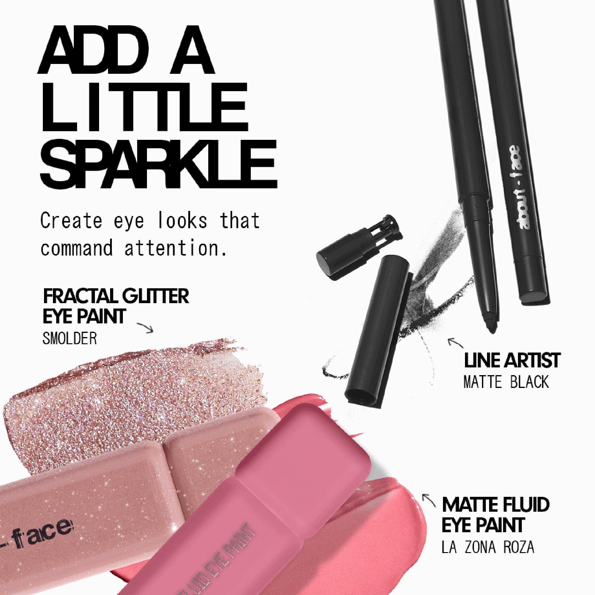 The about-face Fractal Glitter Eye Paint long-wear shimmer and glitter collection goes on velvety smooth, serving luster and vibrant color with none of the fallout or stickiness.