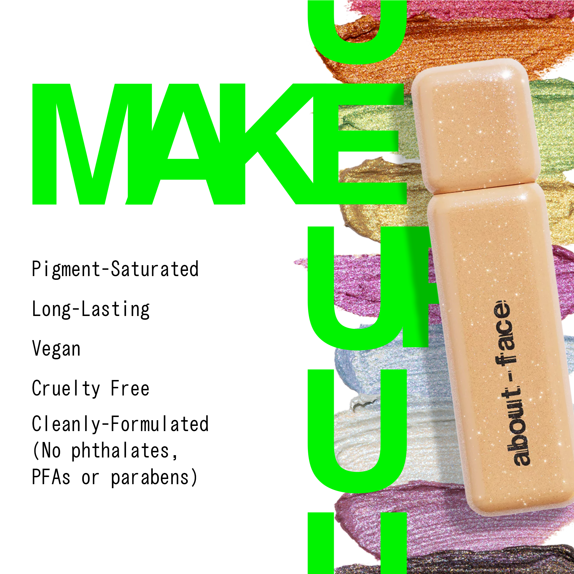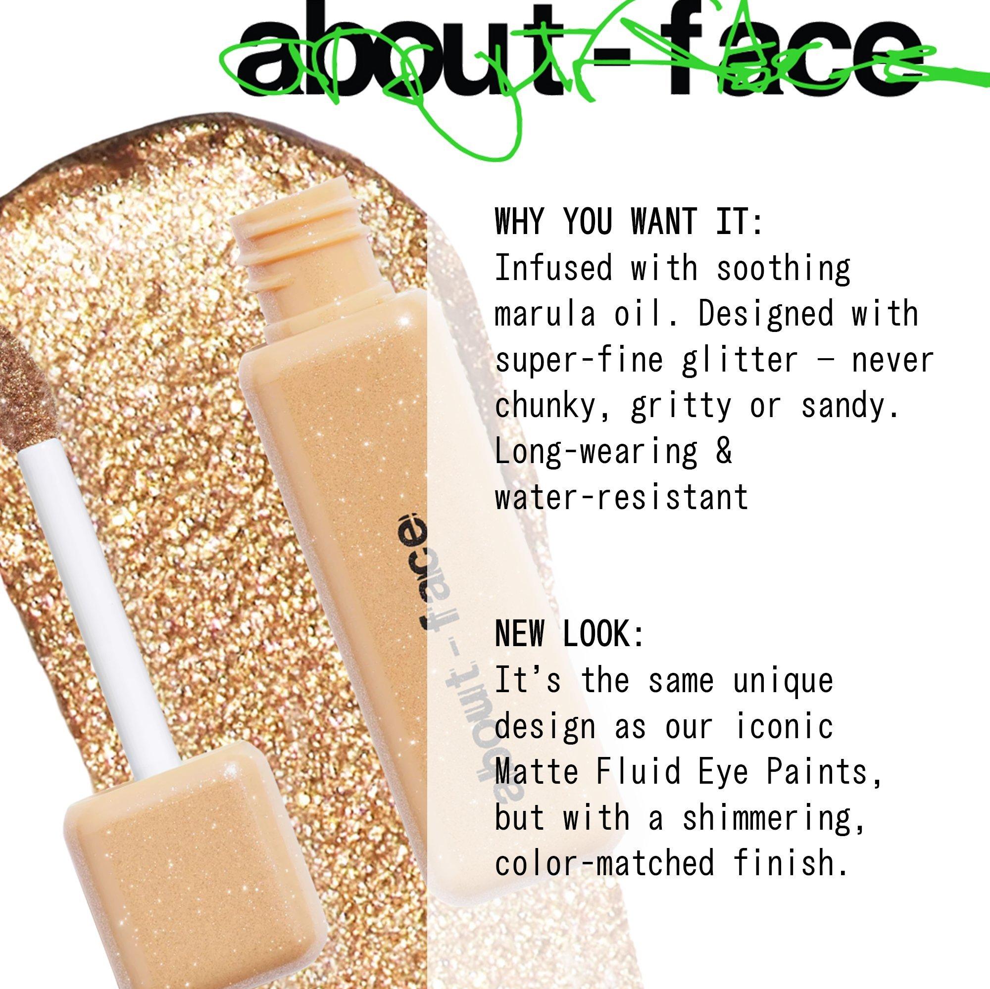 The about-face Fractal Glitter Eye Paint long-wear shimmer and glitter collection goes on velvety smooth, serving luster and vibrant color with none of the fallout or stickiness.