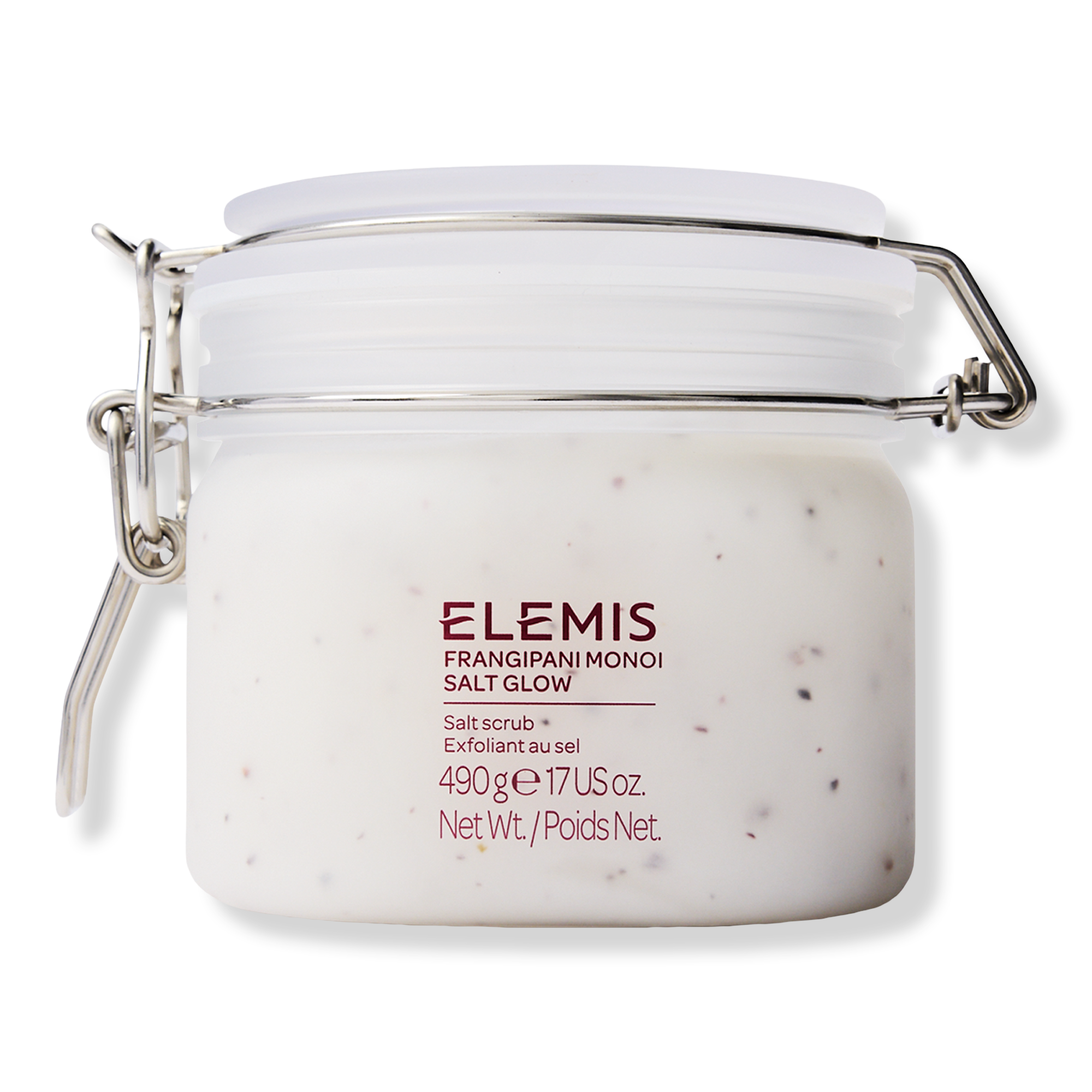 ELEMIS Frangipani Monoi Salt Glow Body Scrub gently exfoliates and softens the skin while sealing in moisture for silky, radiant, and beautifully scented skin.