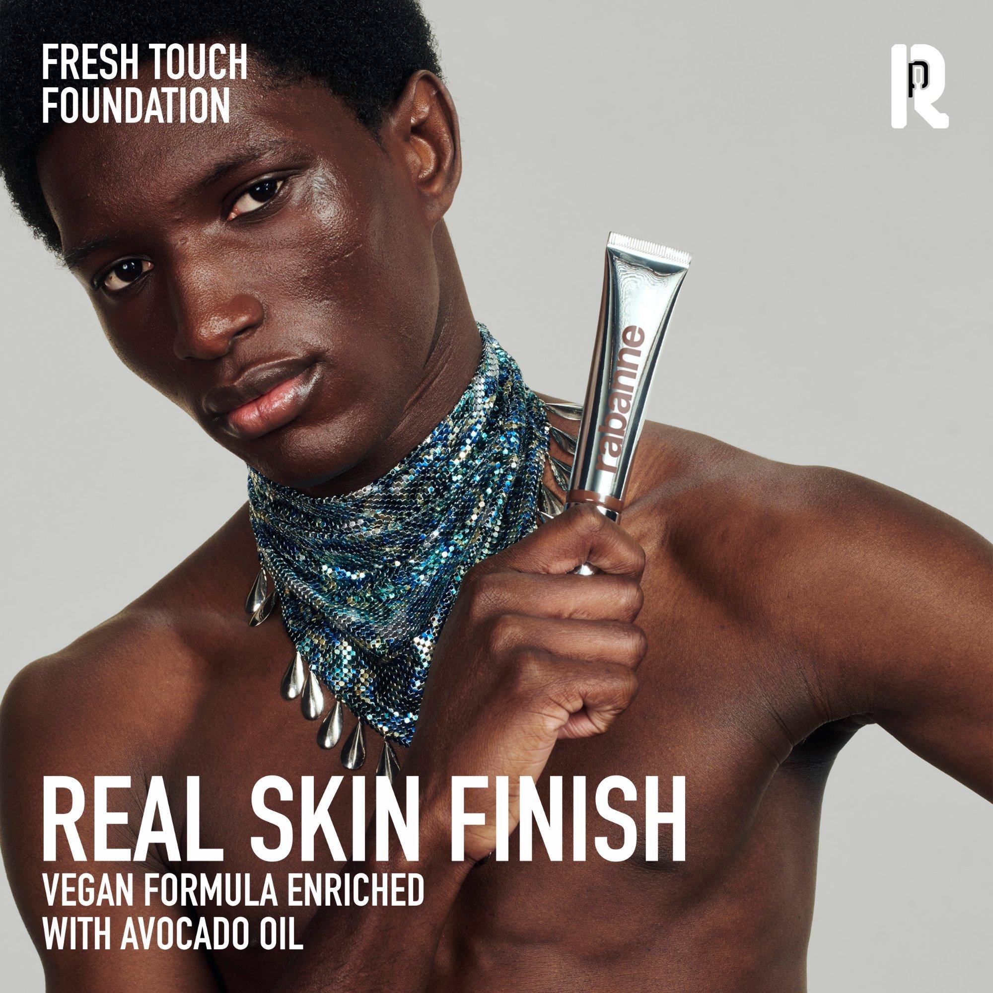 Routine: Dare to reveal the real you and complete your Rabanne Fresh Touch Foundation routine adding Metal Shot (sold separately) as a shot of light to your face.