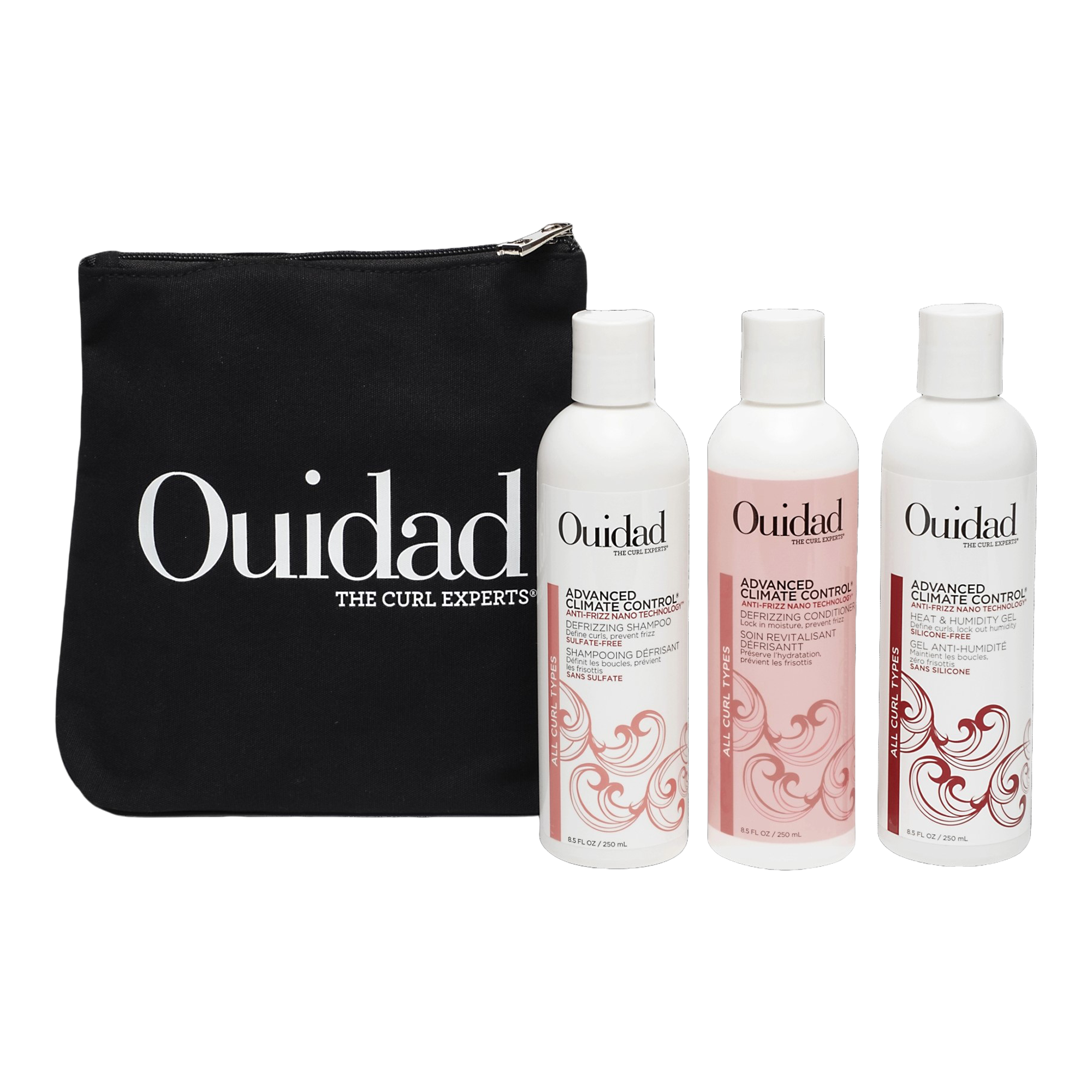 Get defined, frizz-free curls that last with this trio of best-sellers from Ouidad. Created for all curl types, this complete routine features the Advanced Climate Control Defrizzing Shampoo, Defrizzing Conditioner and Heat & Humidity Gel.