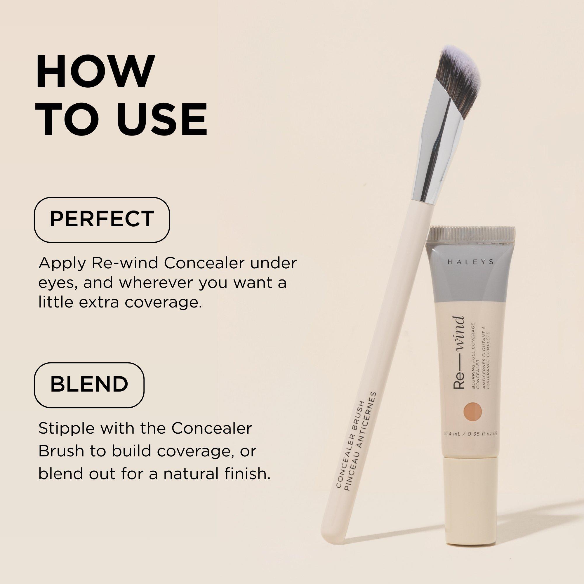Apply a small amount of Re-wind Blurring Full Coverage Concealer directly to dark circles, blemishes or any areas you want some coverage. Blend using the Concealer Brush in a sweeping or stippling motion for seamless, full coverage.
