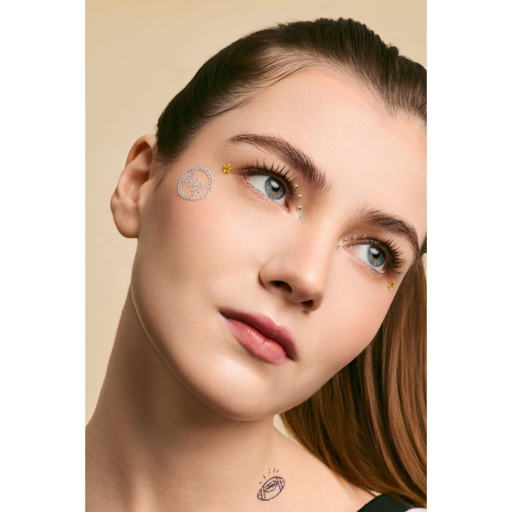 Simple application. Peel the gem from the paper backing and press it into the desired area. Make sure your skin is clean, dry and free of oils for better adhesion and longer wear.