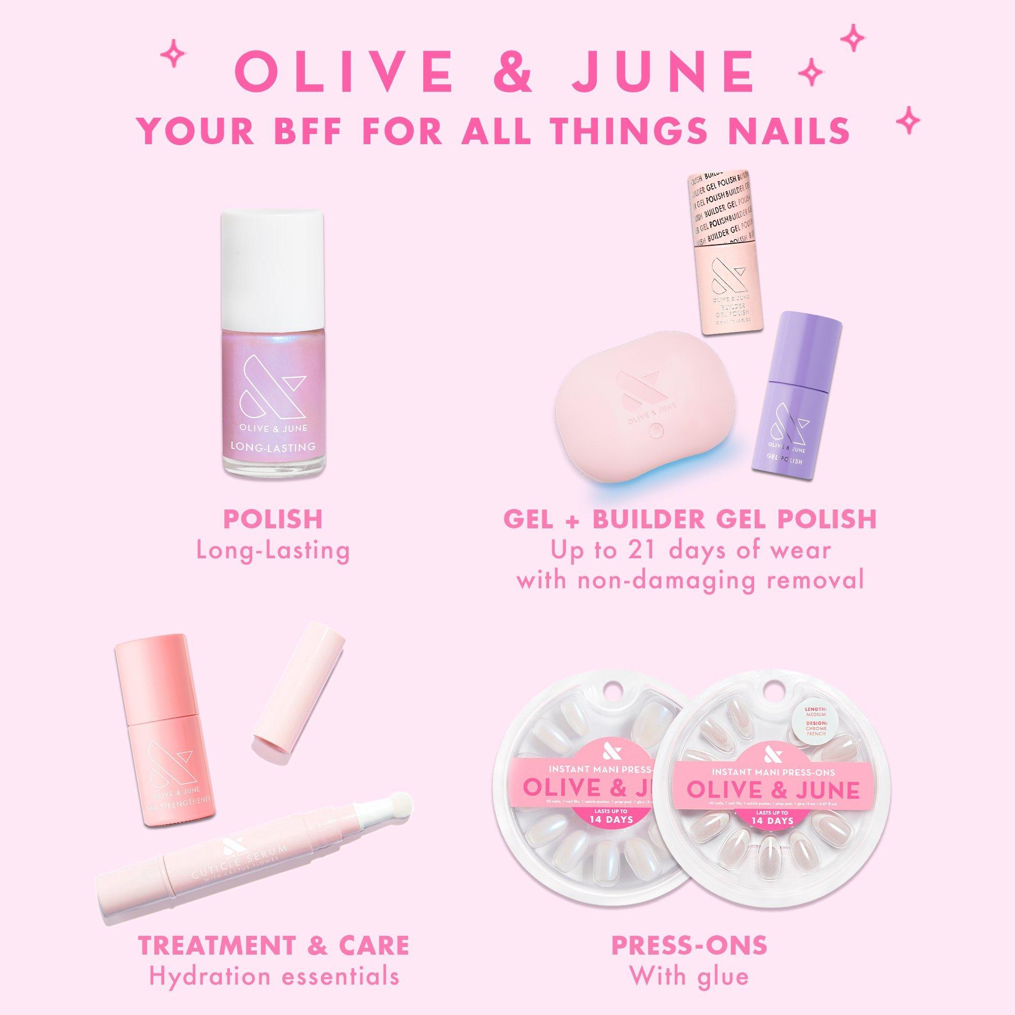 Olive & June HEMA-free, 15-free, long-lasting gel polish for up to 21 days of salon-quality results at home. Removes without damage. UV LED Lamp Needed.