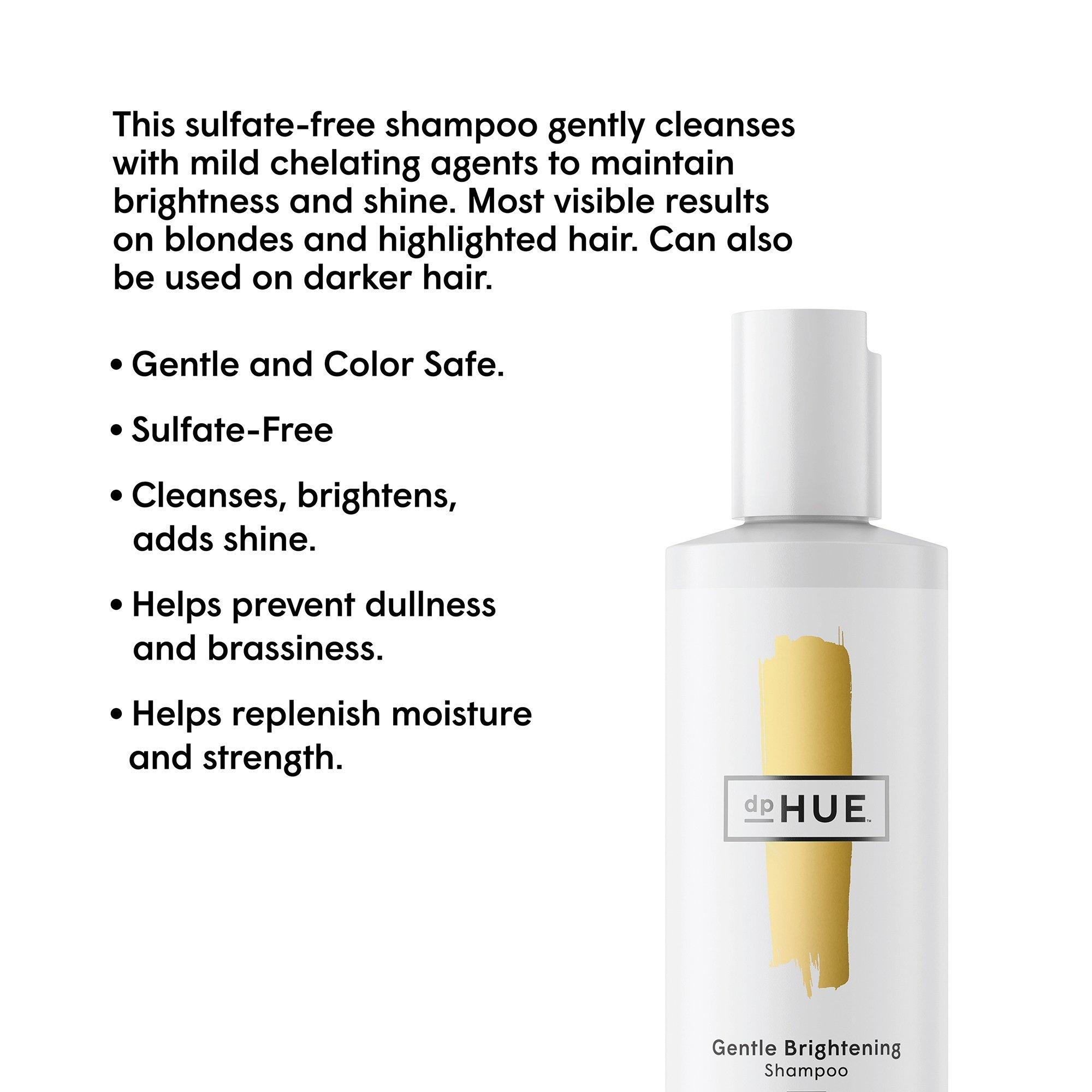 dpHUE Gentle Brightening Sulfate-Free Shampoo is a color-saving shampoo that gently cleanses while boosting brightness and shine. Most visible results on blondes and highlighted hair. It can also be used on darker hair.