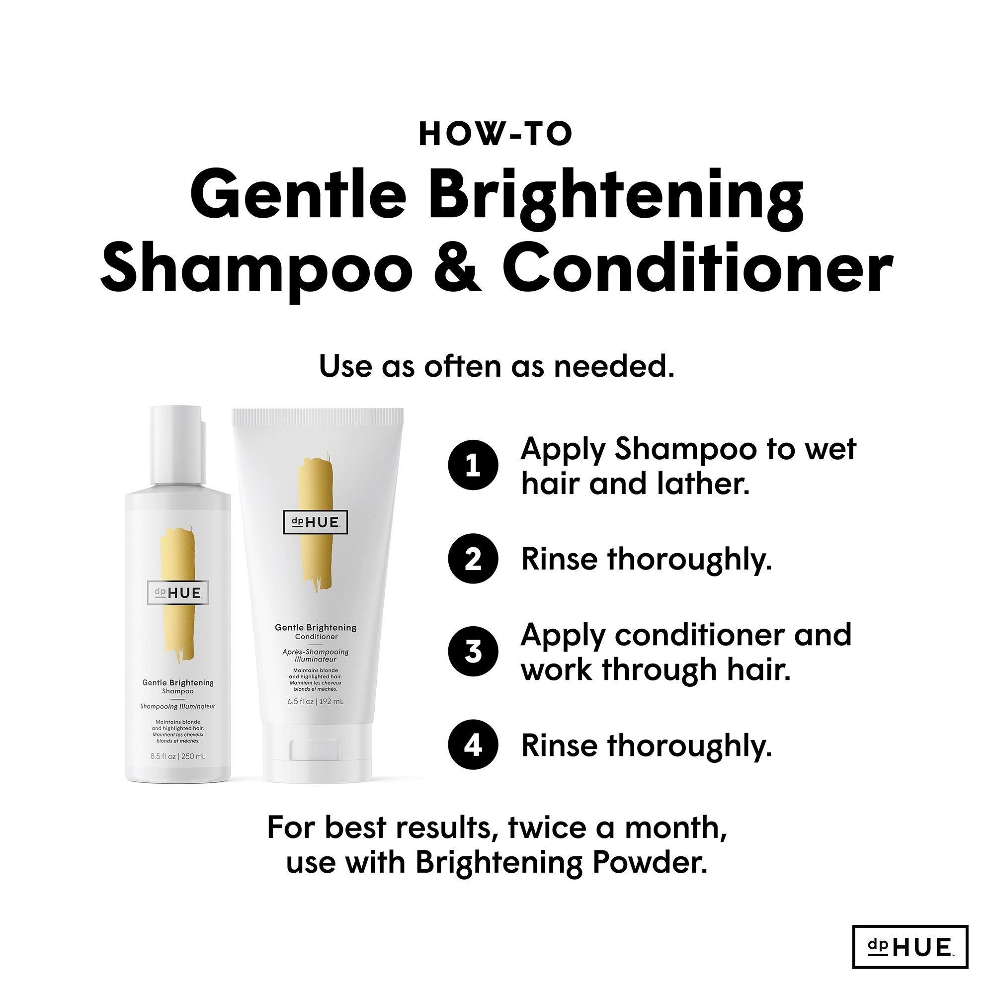 Apply to wet hair and lather. Rinse thoroughly. For best results, follow with Brightening Powder and Gentle Brightening Conditioner. Use as often as needed.