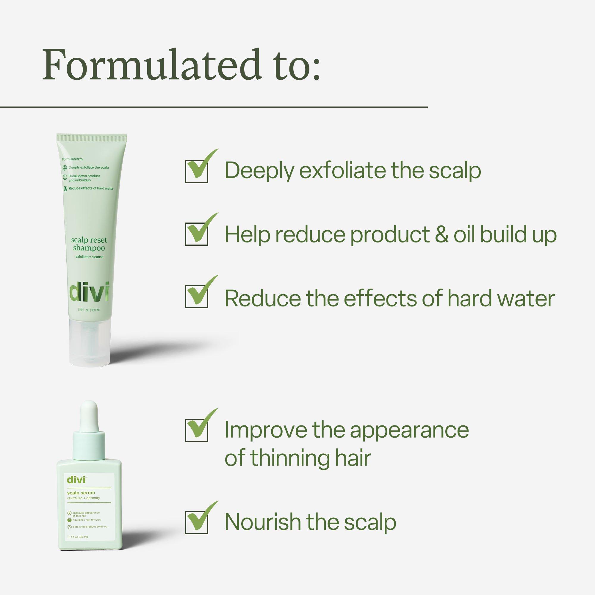 Scalp Reset Shampoo: Once a week, apply to the scalp in sections using the featured precision nozzle and massage evenly in place of your regular shampoo. Rinse thoroughly. Follow with your favorite Divi conditioner.