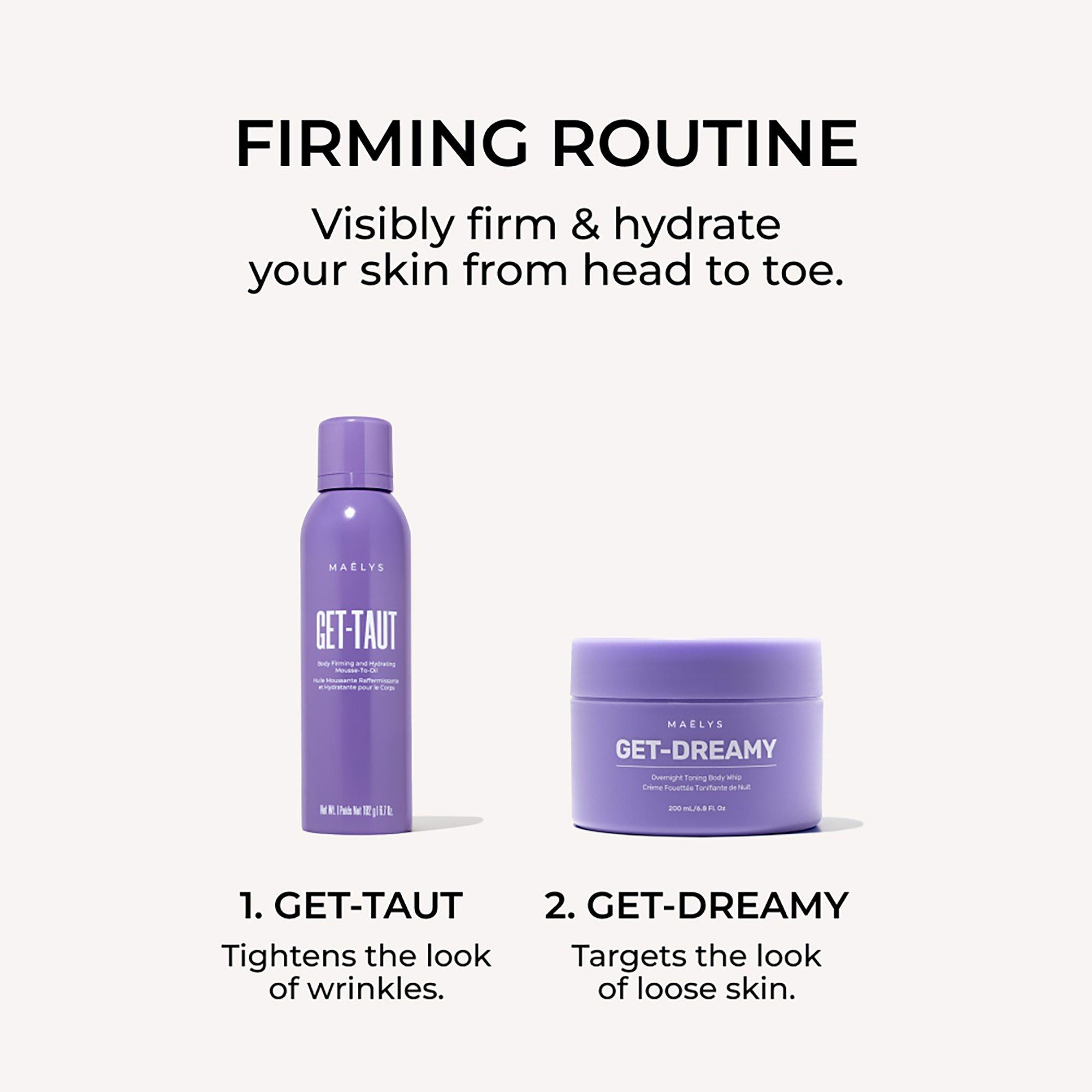 MAËLYS GET-TAUT Body Firming and Hydrating Mousse-To-Oil melts on contact, drenching your skin in hydration for a radiant glow. It’s powered by Glaucine to help tighten the appearance of skin & clinically proven to reduce the look of wrinkles and visibly hydrate the skin.
