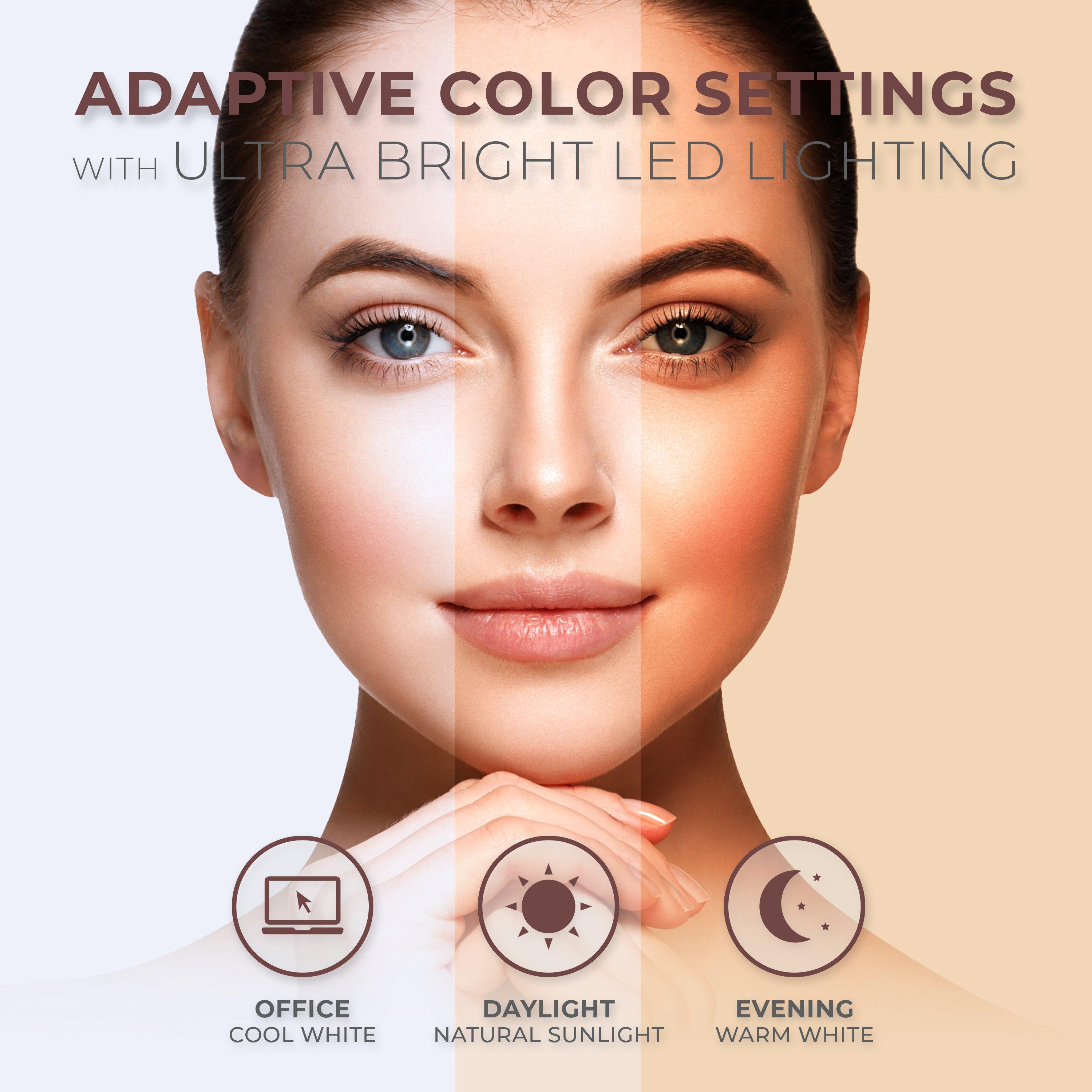 12.75-inch wide by 6.25-inch deep by 16-inch tall. Dual 5-times and 1-times magnification face mirror. 360-degree endless rotating mirror head. 3 color lighting: cool white, daylight, and warm white. Smart dimmer touch control pad.