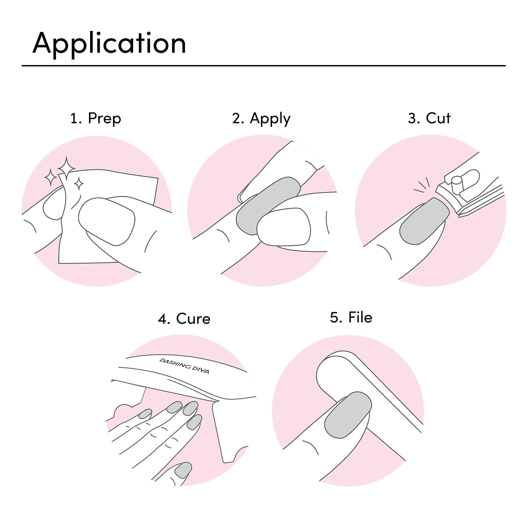 Step 1: Prep - Wash hands with soap and water. Shape nails and push back cuticles. Use enclosed Prep Pad to ensure nails are clear from oils and residue. Make sure your nails are completely dry before application.