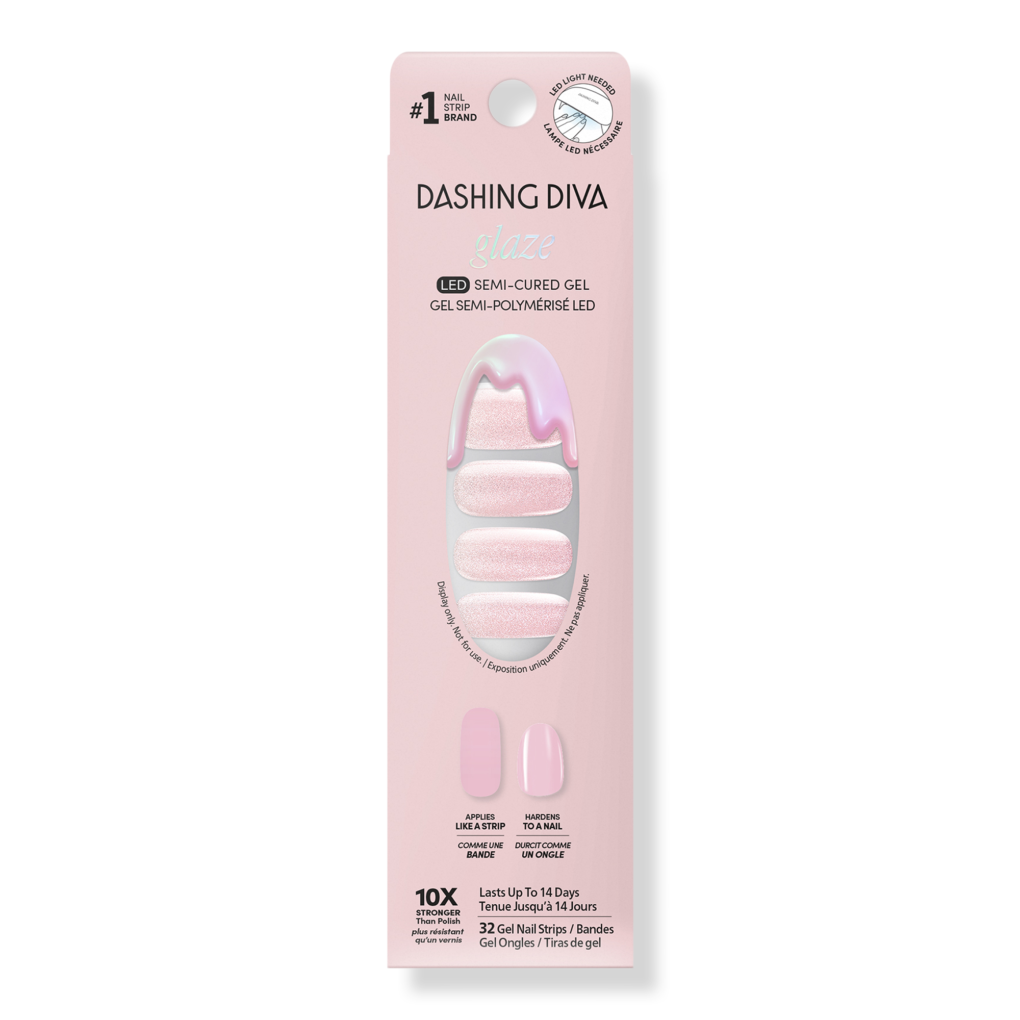 Dashing Diva GLAZE EFFECT Eye-catching finishes for a multidimensional mani. Semi-cured gel nail strips with builder gel–like strength for up to 14 days of wear. Cures with an LED lamp in 60 seconds for a long-lasting, high-shine finish.