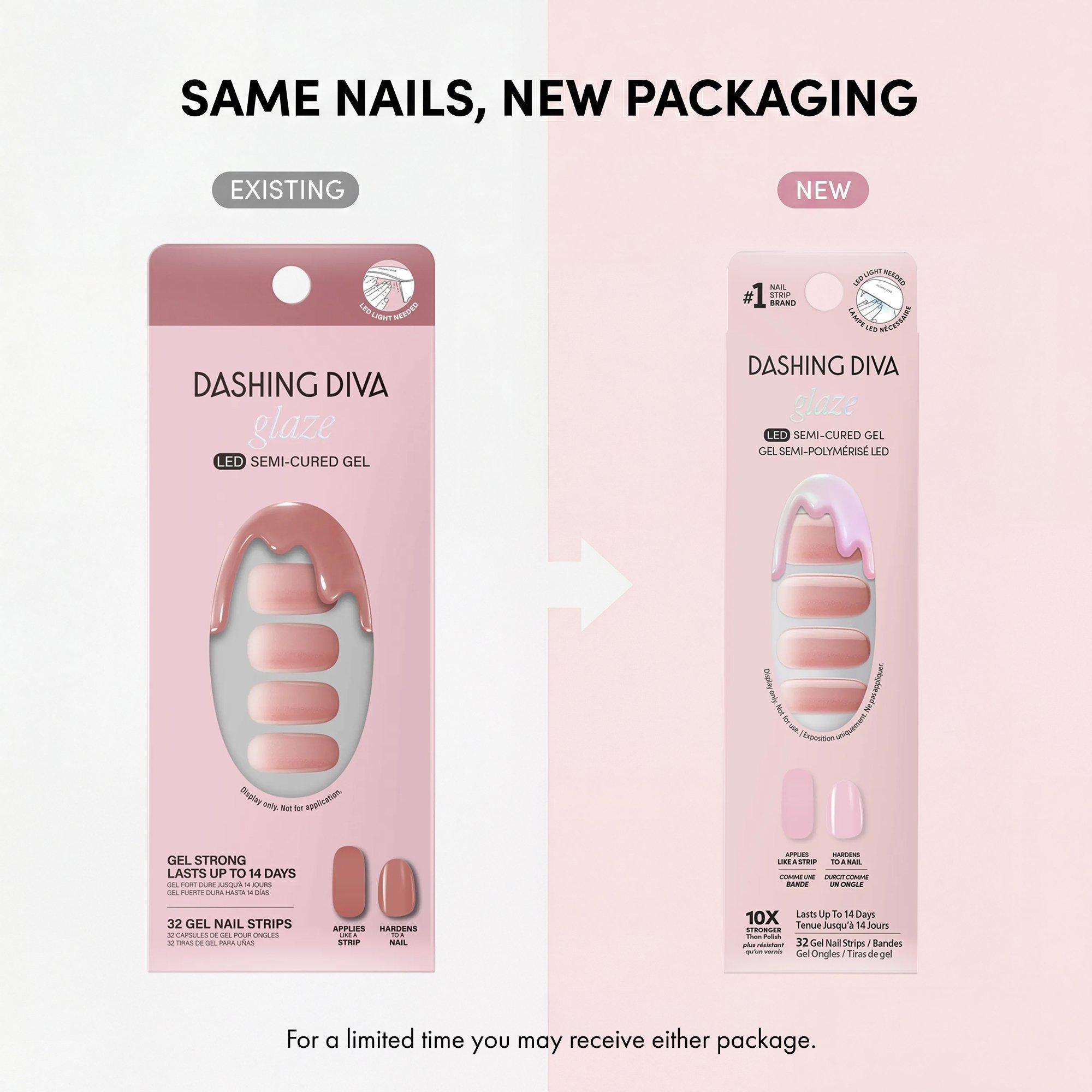 Dashing Diva GLAZE EFFECT Eye-catching finishes for a multidimensional mani. Semi-cured gel nail strips with builder gel–like strength for up to 14 days of wear. Cures with an LED lamp in 60 seconds for a long-lasting, high-shine finish.