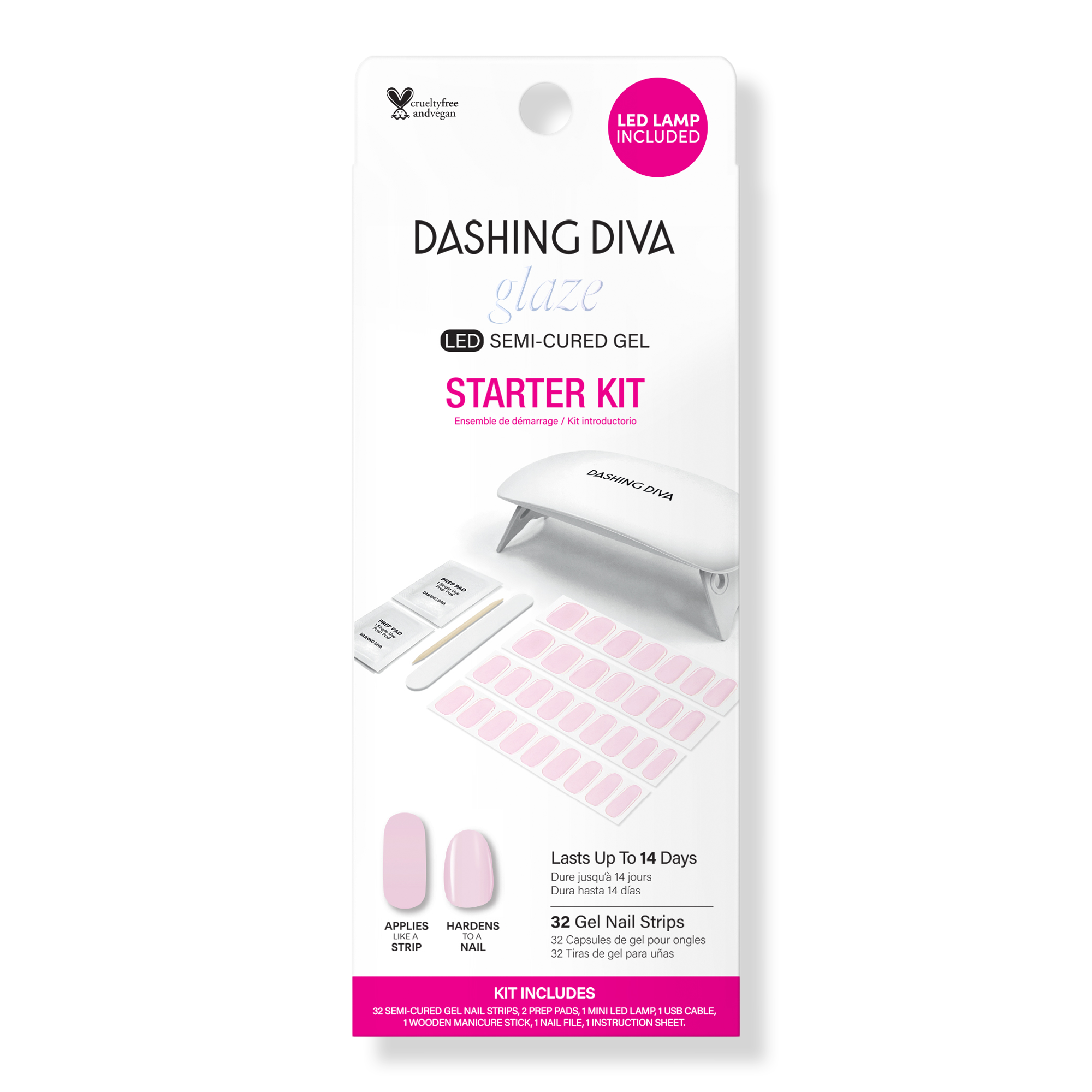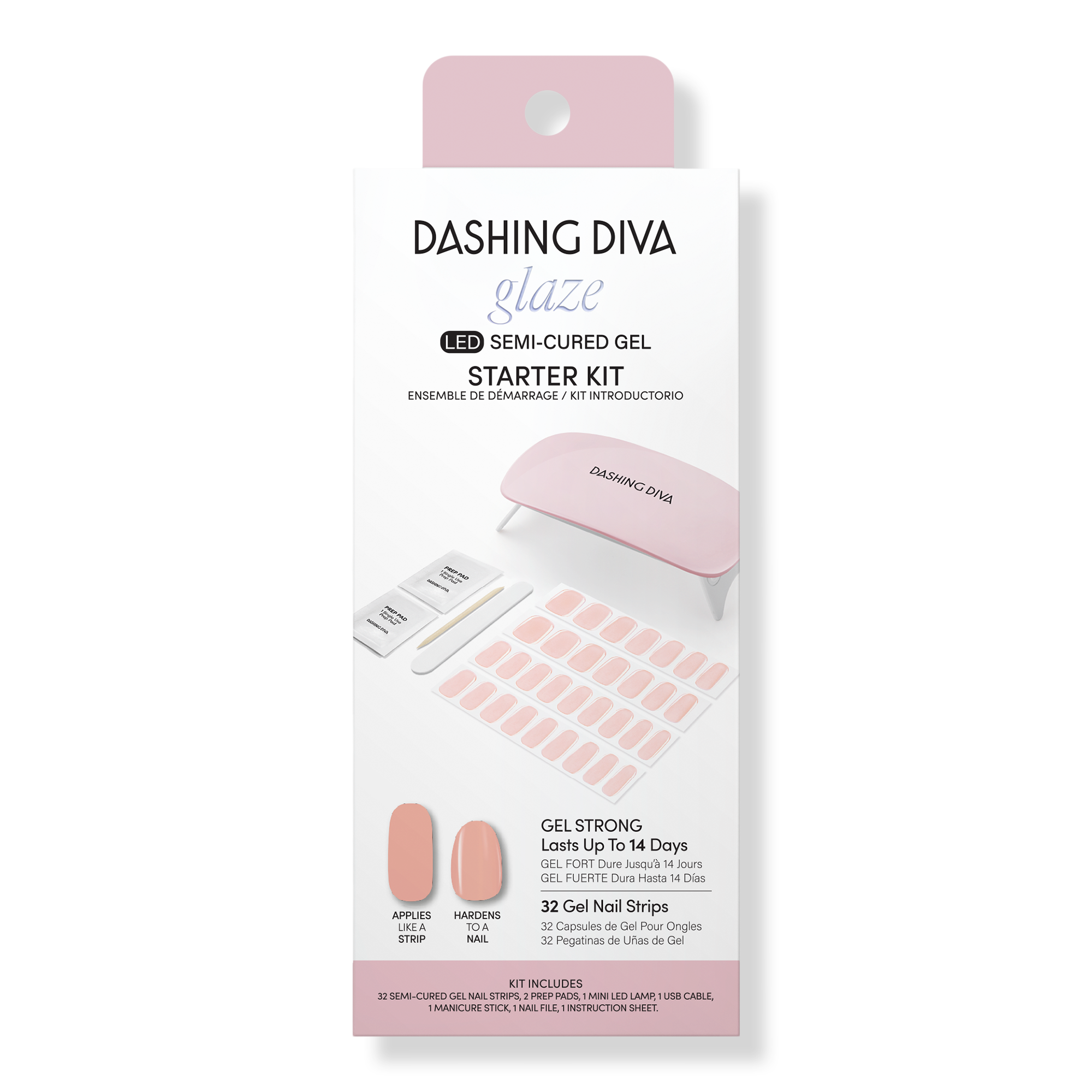 A complete starter kit to achieve the pro-finish and sculpted effect of a salon gel manicure at home with ease. Dashing Diva's GLAZE innovation is a semi-cured gel strip delivering salon results: molded shape, mega volume, and mirror shine that's gel strong for up to 14 days.