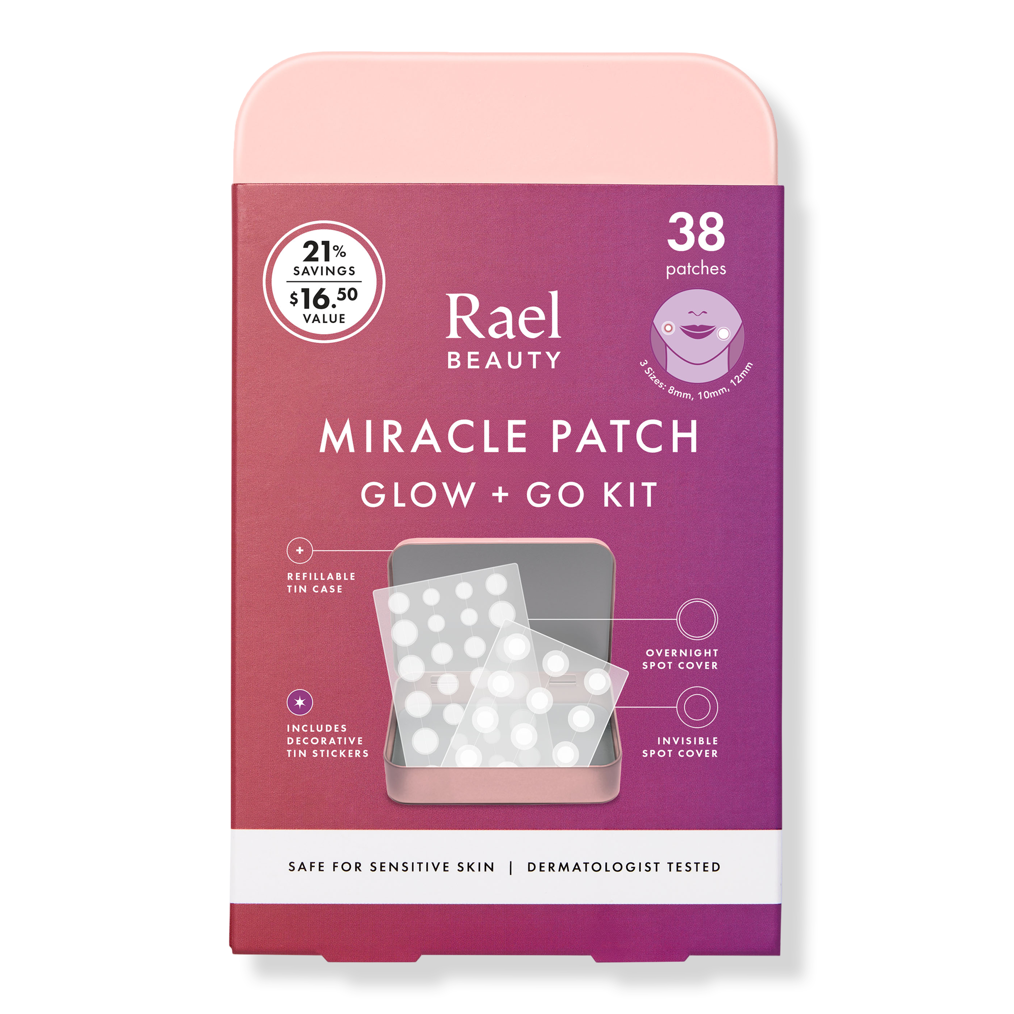 Rael’s Glow and Go Miracle Patch Kit features two best-selling pimple patches that keep you covered day and night. Hydrocolloid absorbs oil and impurities to help flatten blemishes and promote clearer, smoother skin—all packed in a refillable, travel-friendly case.