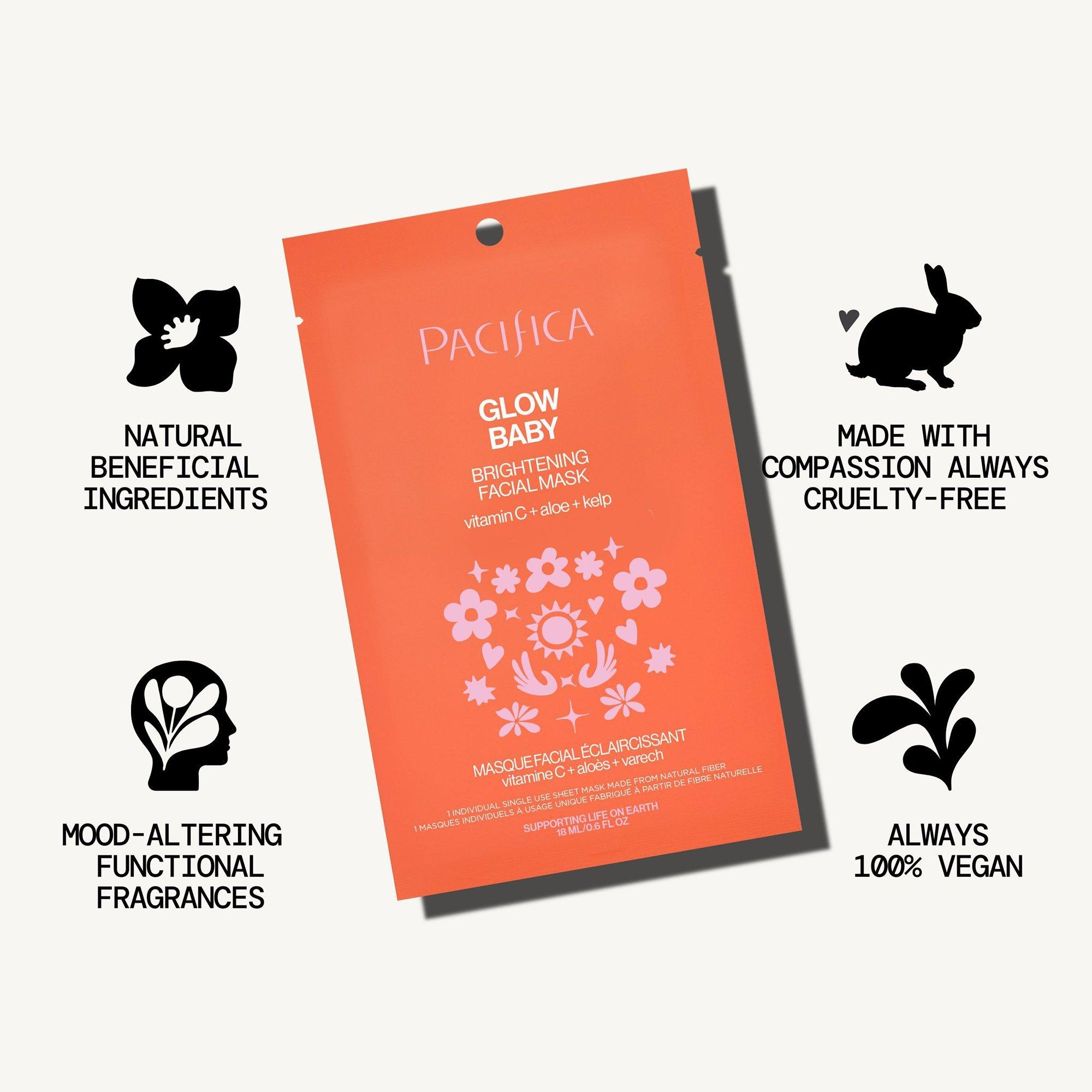 Pacifica's Glow Baby Brightening Facial Mask is a natural sheet mask infused with a fast-absorbing brightening serum for instantly glowing skin.