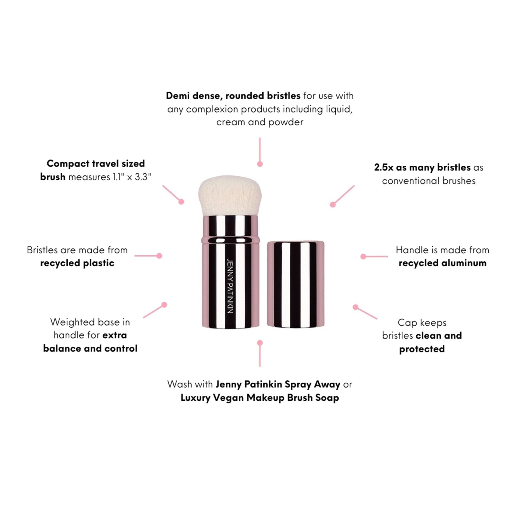 A retractable travel makeup brush with 2.5x more ultra-soft recycled bristles for smooth, natural-looking touch-ups. The domed brush glides effortlessly, while the lid keeps it clean on the go. Ideal for powder, bronzer, or highlighter anytime, anywhere.