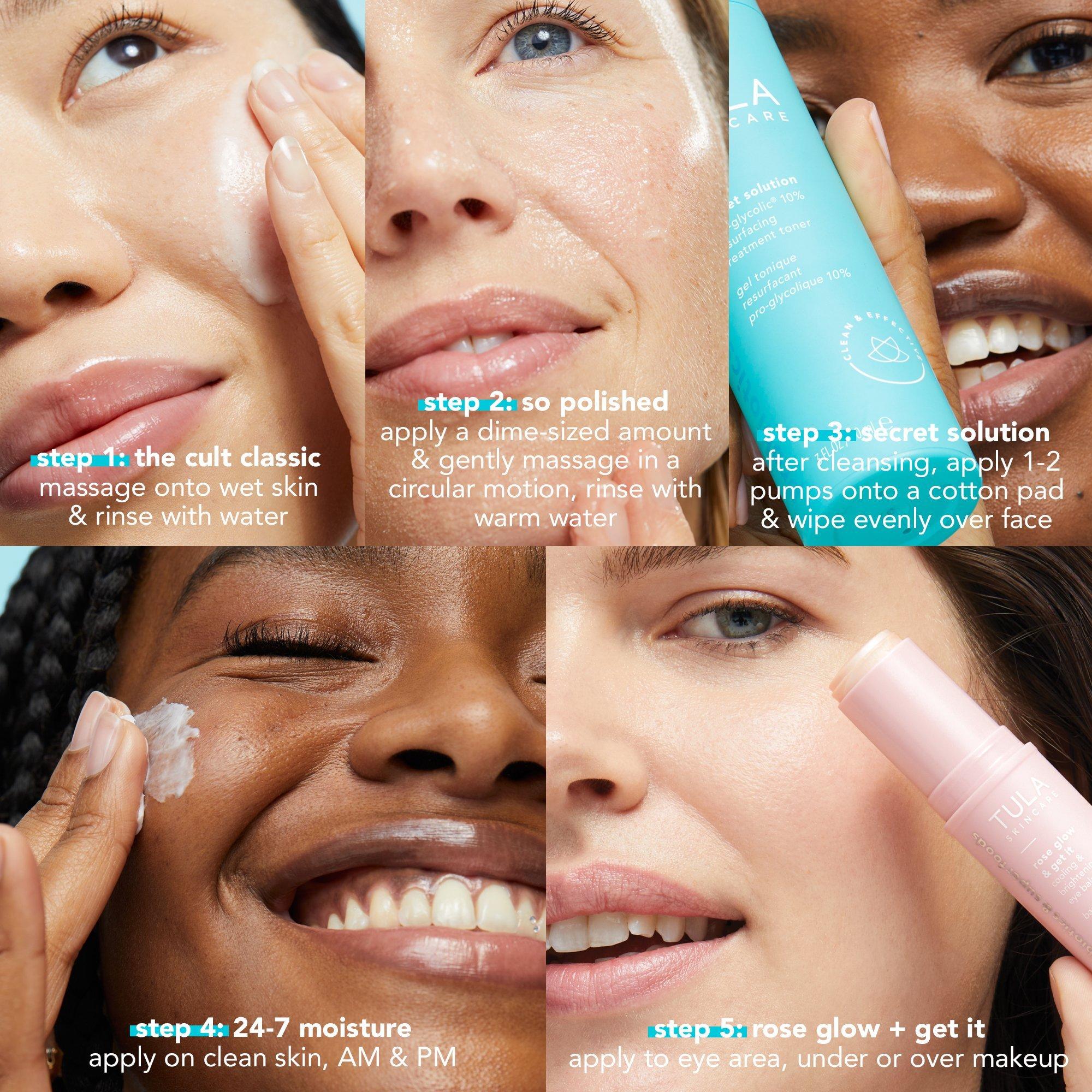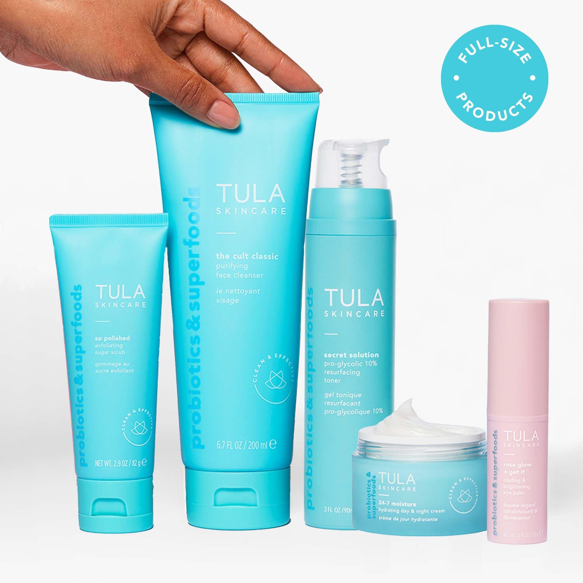 TULA's Glow Starts Here Bestselling Skin Essentials Kit is a 5-piece kit with full-size bestselling TULA essentials for healthy, smooth & radiant-looking skin. Each product can be included into any routine or used as a complete regimen for smooth, radiant-looking skin.