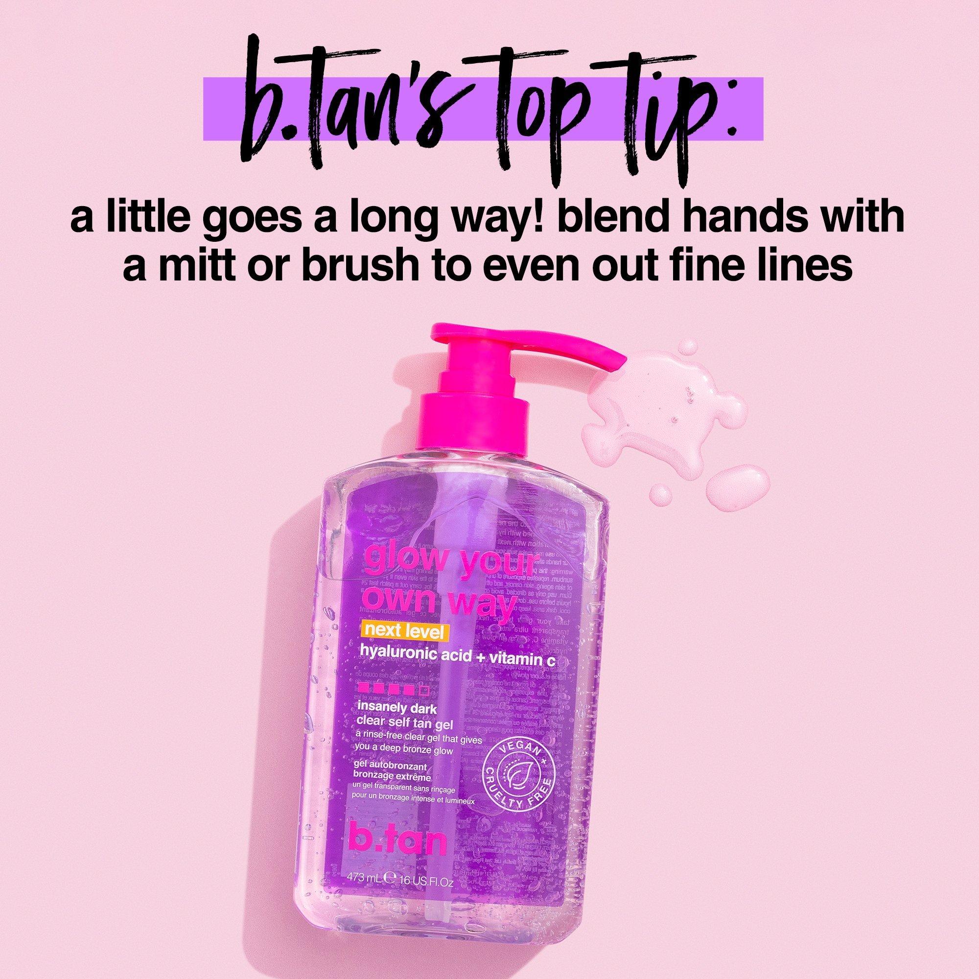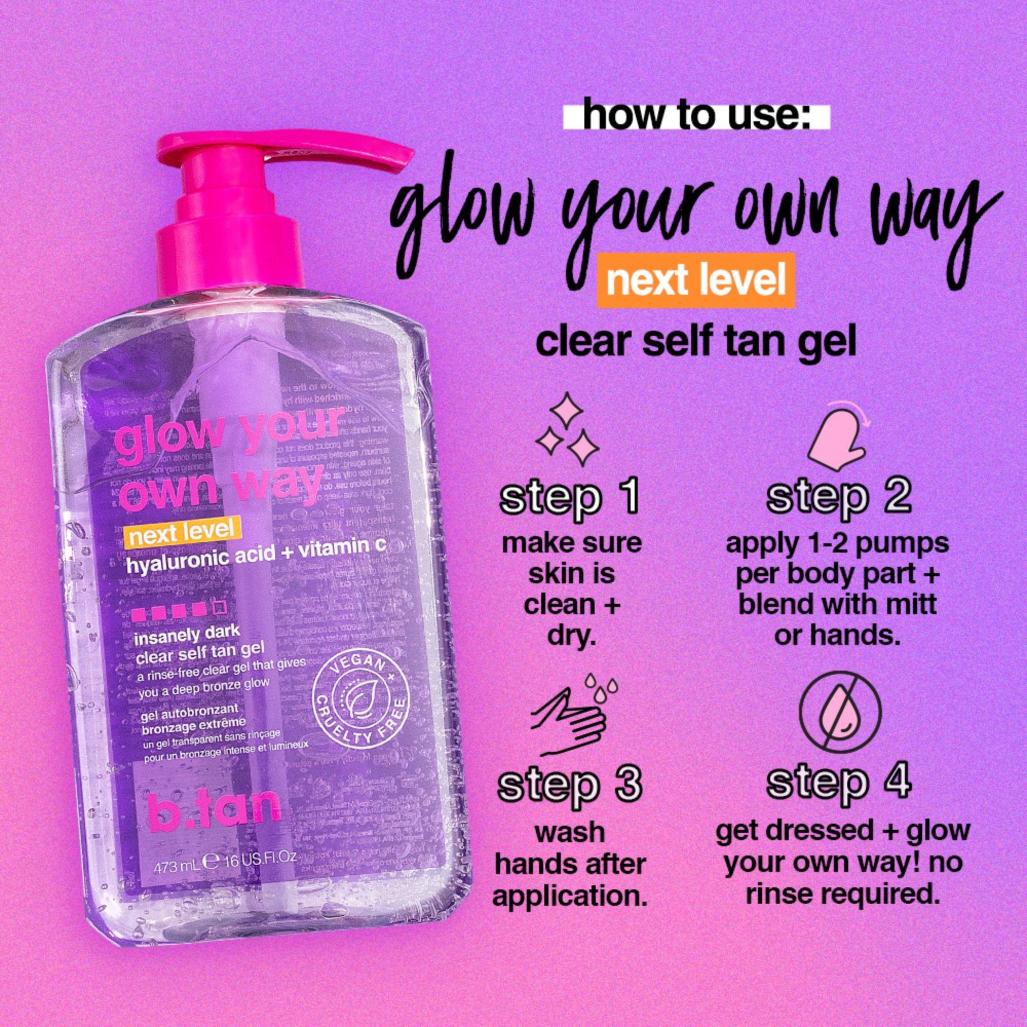 Get an even darker tan and glow your own way with b.tan next level transfer-resistant, rinse-free clear tan gel for extra deep color results. Get the juiciest, moisturized dark glow yet. Just the way you like it.