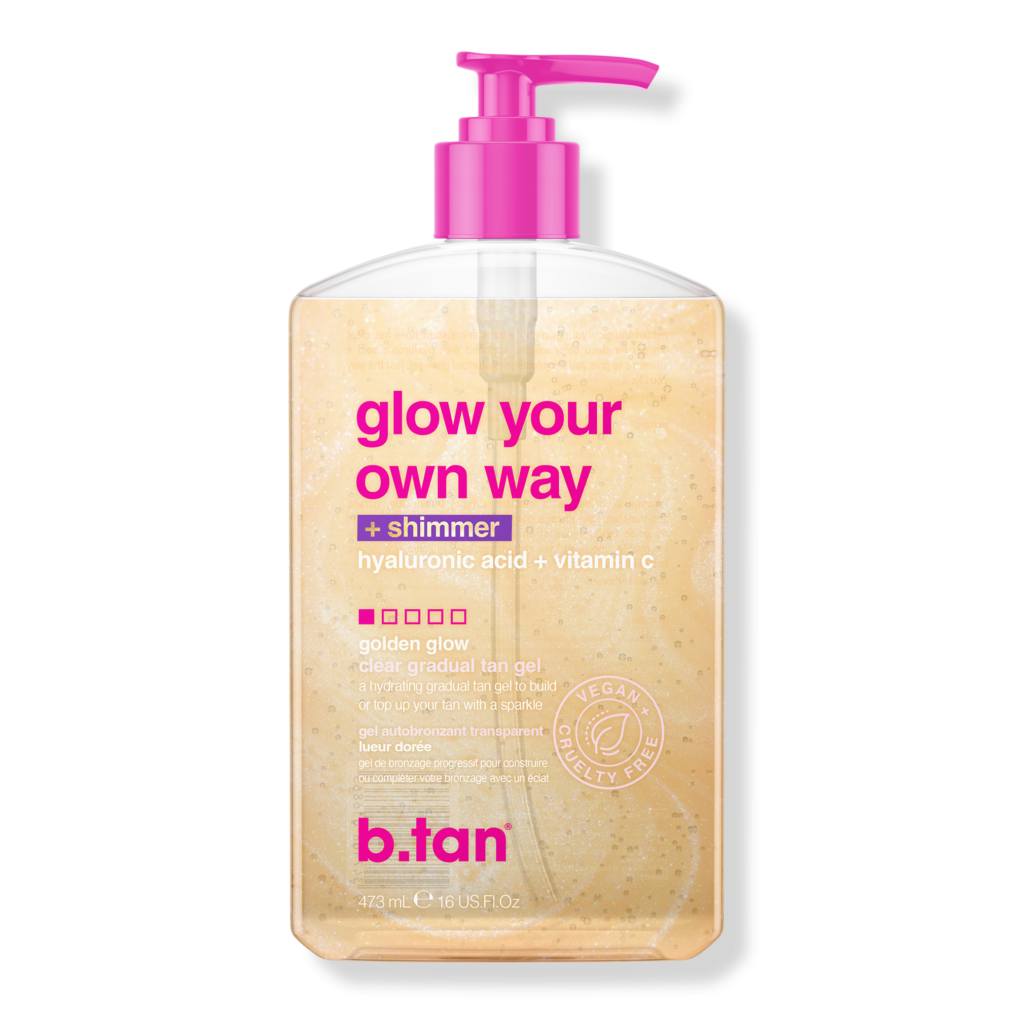 b.tan Glow Your Own Way + Shimmer Shimmering Clear Self Tan Gel - All that shimmers might be gold! A self tan gel with gold shimmer to sparkle like the bright diamond you are, all while tanning yourself to golden perfection.